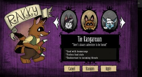 This mod adds Rakky as a playable character for base Don't Starve, Reign of Giants, Shipwrecked, and Don't Starve Together. He has custom dialogue and a custom voice.