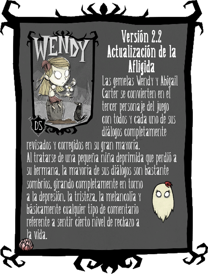 - Diálogos de Wilson, Wheeler, Wendy, WX-78, Webber, Walani, Wormwood, Wickerbottom, Wagstaff, Willow y Maxwell totalmente corregidos y traducidos.