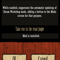 While enabled, suppresses the automatic updating of Steam Workshop mods, adding a button to the Mods screen for that purpose.