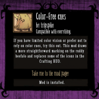 A redditor requested a mod for those with color vision impairment, so they could better know when beefalo are in heat. Beefalo are critical to many gameplay strategies, and if you must disable the ruddy buffalo, then they cannot reproduce. I also added (optional) HUD features for color cues that fell squarely in the green/red/grey range that is difficult to see if you experience red or green weakness.