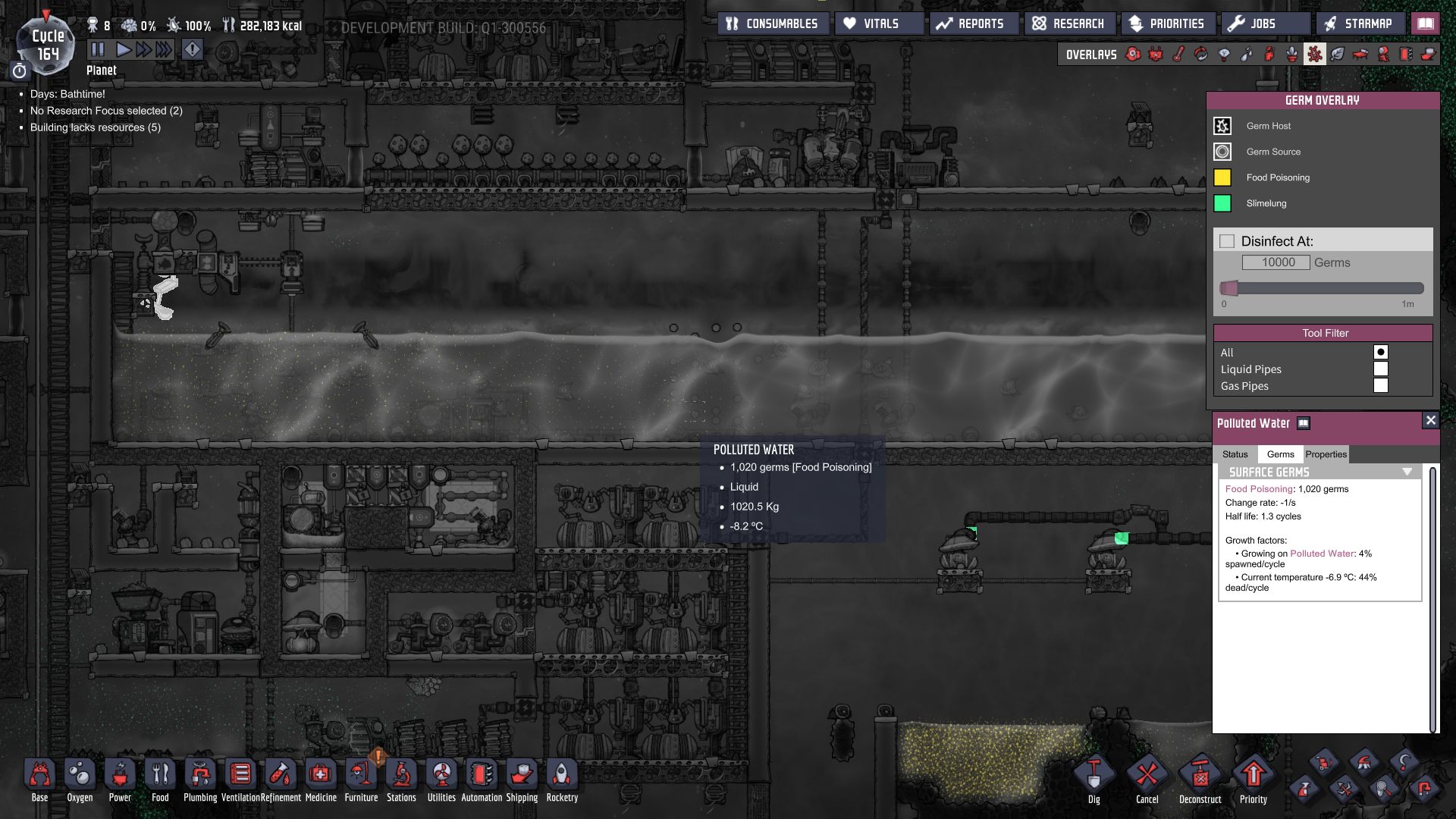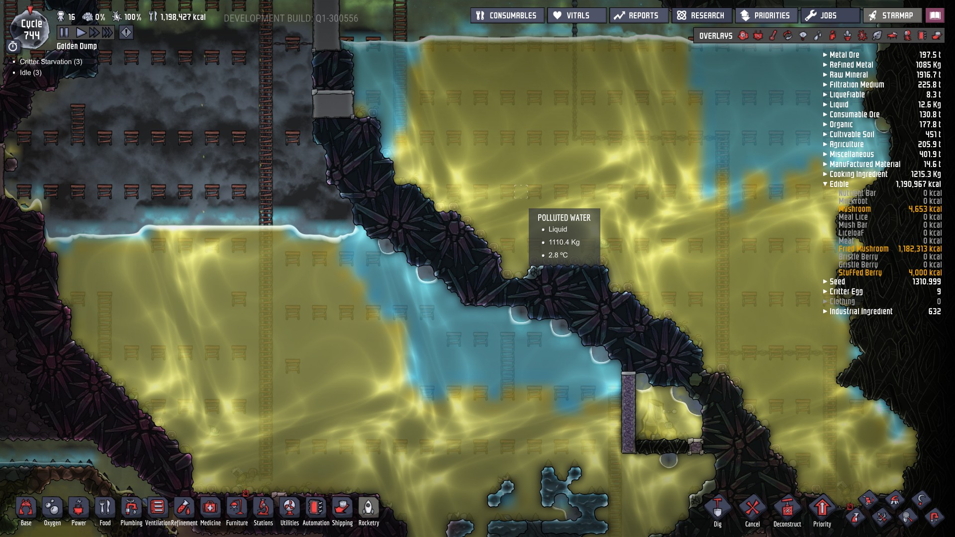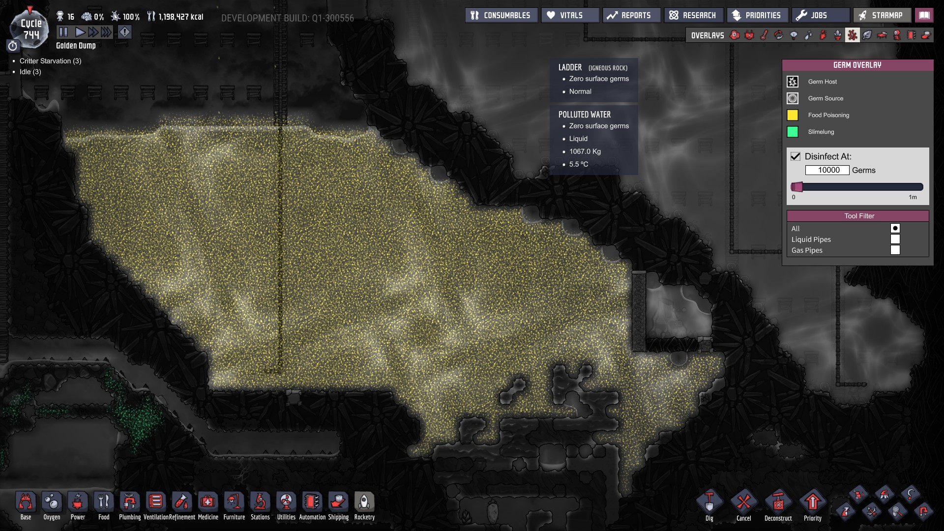 Sigma Cypher Posted December 28, 2018 Share Posted December 28, 2018 Sorry, we're not done with your thread yet @ONIfreak I agree with chlorine being the superior method. No doubt. And for something less efficient -- how about gulp fish? I never _meant_ to de-germify this water, but it happened anyway when I started using the polluted water tank in a radiator loop for my methane distiller. And each gulp fish is making 200g/s of regular water from polluted water. I'm not sure if the gulp fish de-germifies the water or if the cold temperatures are doing it. I'm losing 44% per cycle in the cold but not frozen water. Started cycle 40-ish at 40 million germs (?I think) and now half the pool is completely clean and the other half has 1000 or so left -- and the dupes do their business in it, not to mention the fish. Disgusting I know... Link to comment https://forums.kleientertainment.com/forums/topic/101162-how-to-clean-water-from-germs-in-large-quantities-any-idea/#findComment-1137255 Share on other sites More sharing options...