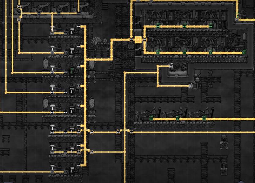 Frag31337 Posted January 1, 2019 Share Posted January 1, 2019 I just give u the way For long distance periodical hight wattage usage. Generation zone Then transportation with metal wire(2kW) to usage zone (about 6kW max, Bunkers and scaners) And that how i split power from 2kW to 6kW(= Main idea is that i need no use 2kW power every second but some time(METEORSCOOOOMING) i need to power 30 +doors in one second(i`m so lazy to create smart door opening system). In that moment all batteries are full of charge and they give power to doors. When charge in battery low(lower than 90%) - it connect to input wire and get energy. Automatization guaranty that in one moment it will be just one output line. I use such splitters in many places. For example Rest Room use 4kW+ of energy, But such system give me right to use just one Wire in input there too. Link to comment https://forums.kleientertainment.com/forums/topic/101307-splitting-power/#findComment-1138255 Share on other sites More sharing options...