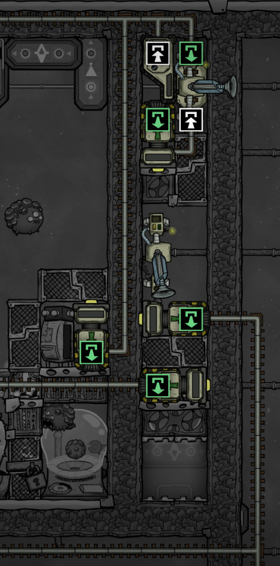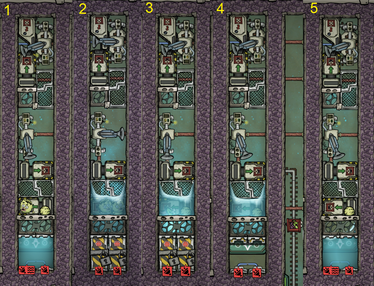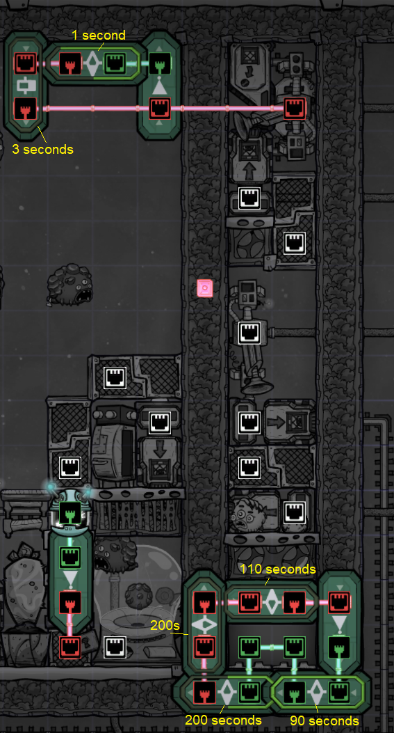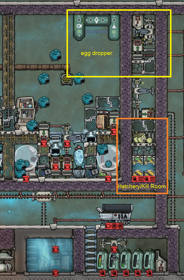 ChickenMadness Posted January 4, 2019 Share Posted January 4, 2019 How to setup an automated Egg dropper - Hatchery - Kill room for meat farming When I was looking around the forums trying to find out this information for myself it was scattered over a bunch of different threads, and a lot of the designs were overly large and complicated as well as being old. so I thought I'd bring it all into one thread with this design I've come up with. It's for fully automated ranching so that you can make BBQ instead of omellettes. Or have a mixture of both. It's 16x4 tiles (the same height as 3 bedrooms stacked on top of each other, so 3 levels of your base)credits to. @Craigjw . for showing me the egg dropper automation. and . @Mullematsch . for the kill room idea. (also if anyone is wondering about the dense puft ranch, I'm very close to finishing the entire thing with seperate fully automated hatchery ranches for each puft variant. Gonna make a thread for it soon. And hopefully it will inspire others to improve on it. Took a break from designing it for a few days because it was giving me a headache. Some of the information in-game about the egg chances is misleading [and annoying])Larger screenshot of the whole ranch, kill room, kitchen, storage for context. just so you can see how it would fit next to a ranch and kitchen in your base. This is in a sandbox testing colony. You could build it next to any ranch and send eggs into it. (drecko, hatches, etc.) I'm not sure if it kills slicksters though, I think they can survive underwater. Not tested it. There is a sweeper arm inside the ranch sending eggs towards the egg dropper... The sweeper arm inside that room gets turned on for 3 seconds.. and then turned off for 1 second... And this is repeated forever (using the automation logic). So it's enough time to pick up the egg, but not enoguh time to load it, so the egg is dropped and falls through the mesh door into the kill room below. Kill room needs to be out of range so it won't pick the eggs back up.Egg dropper and Kill room Once the doors close at the bottom the hatchery room is flooded and everything dies. The lower sweeper arm moves meat into the central conveyor loader which is sent to the kitchen. Egg shells are sent into the bottom conveyor loader which goes where ever you want that to go. Can be sent to a compost room or rock granulator. I usually compost egg shells for dirt since fossils provide you with more lime than you need (especially now that you don't need to build a space wall to stop the meteors destroying the map). AutomationEgg dropper You can move the automation inside the egg dropper room. I just kept it seperate so that it's easy to see. -Filter gate set to 1 second. -Buffer gate set to 3 seconds.Kill room I compacted this one into the small space... -There are 600 seconds in a cycle of the game... -So the filter gates add up to 600 seconds... -The doors close for 90 seconds once per cycle. (just about enough time to drown the critters) -Then open for the remainder 510 seconds. (200s +200s +110s) -Then it repeats.shippingEgg dropper room... -Conveyor receptacle priority is set to 1 (lower than the loader). -Conveyor loader priority is set to 2. -Conveyor loader is set to pick up critter eggs. -Eggs are sent from the ranches into the conveyor receptacle. -The conveyor loader is looped back towards the receptacle using a bridge (not sure if bridge is necassary, it's a visual thing to see it better.)Kill room I think it's self explanatory. -The important thing to note is that it is out of range of the upper sweeper arm (in the egg dropper room) to prevent the eggs being picked back up. -Also the bottom sweeper arm can't put eggs into the loader in the egg dropper room, because of the mesh tile. That mesh tile is important. -Meat is sent into one loader -Egg shells into the other. Link to comment https://forums.kleientertainment.com/forums/topic/101432-guide-automated-ranching-egg-dropper-kill-room-meat-farming/ Share on other sites More sharing options...