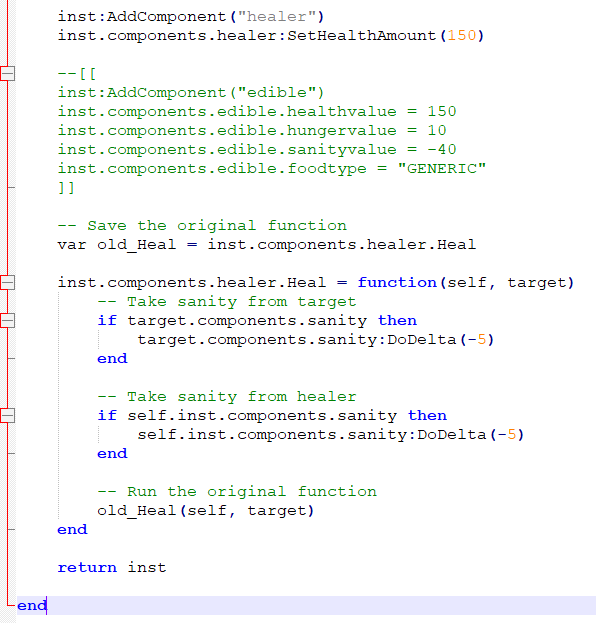 Ultroman Posted February 17, 2019 Share Posted February 17, 2019 (edited) The first version is correct. And I messed up I've been switching between C# and LUA, and in C# you can declare a variable with "var" but in LUA (in this case in particular) what we want is "local". Change the first line to: local old_Heal = inst.components.healer.Heal Edited February 17, 2019 by Ultroman Link to comment https://forums.kleientertainment.com/forums/topic/102936-how-to-make-a-healing-item-that-also-harms-sanity/#findComment-1156284 Share on other sites More sharing options...