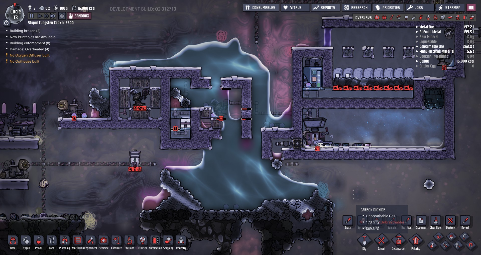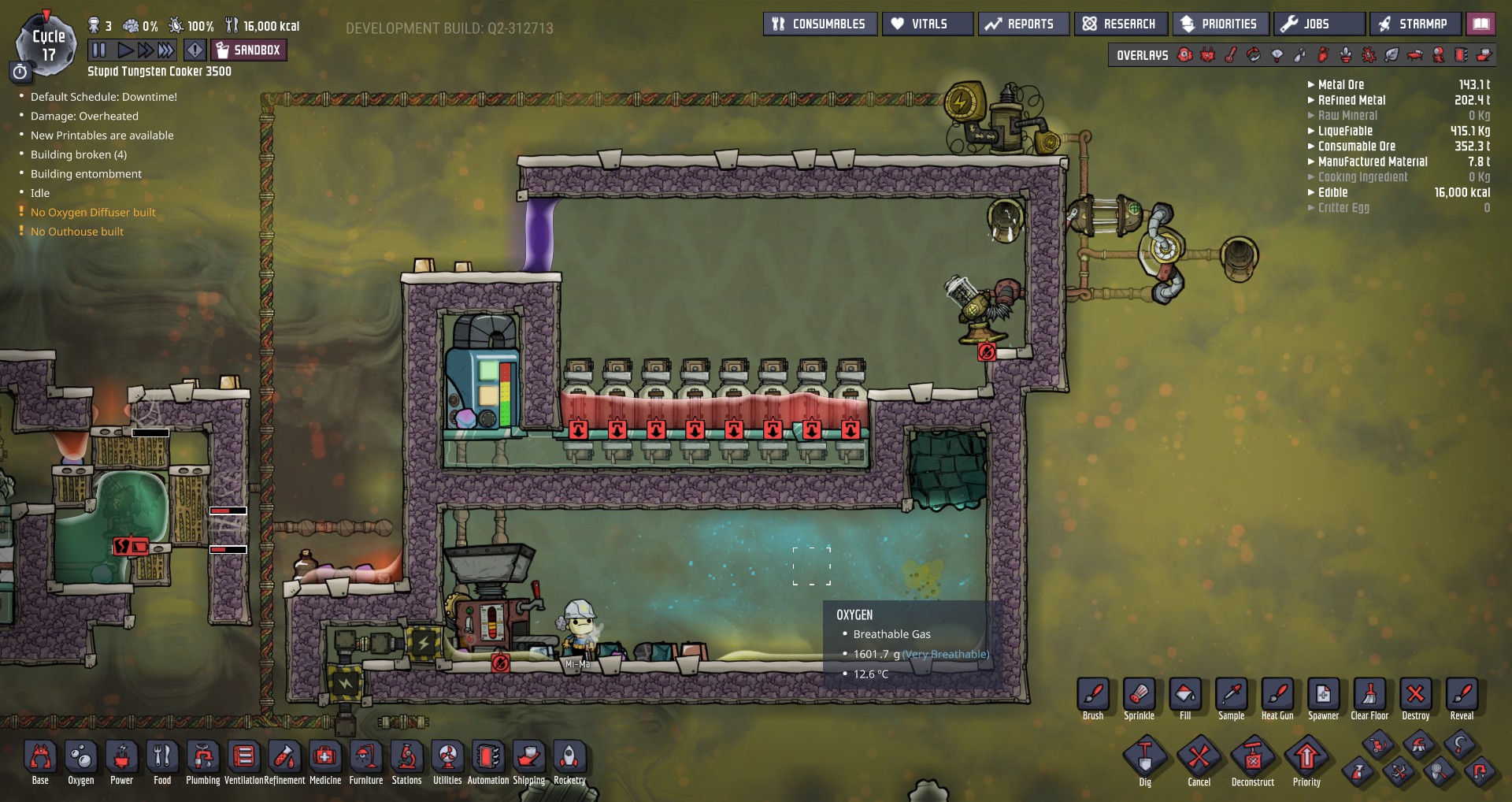 GemeinerJack Posted March 20, 2019 Share Posted March 20, 2019 @mathmanican asked me to do another stupid build, since i was bored in my no wheezewort no aetn base anyway, i present: STUPID TUNGSTEN COOKER 3500 First off: It is possible to melt insulation in survival! Theory time: Insulation melts to tungsten at 3621.85 °C Looking at other materials: Tungsten: 3421.85°C Wolframite: 2926.85°C Thermium: 2676.85°C Igneous Rock: 1409.85°C So every possible building material (stone, ore, metals) for a more sophisticated setup is already a liquid or gas at this point. Since liquid building tech is not acessable by dupes... We got Diamond with 3926.85°C, so we can use glass tiles and temp shift plates... end of list... (unless someone shows the dupes to build more stuff from diamond, fullerene, genetic ooze or refined carbon...) Oh, and of course, insulated insulation tiles to prevent the super heat from escaping. At least the refinery is able to handle super hot coolant Next step: fastest way i know of: run the hot liquid directly trough standard pipes made from insulation... But then we got problems like mixed liquids random behavior or stuff like that... So for know, since i need to go to bed: So we use the mechanics of the reservoir: Liquid inside don't exchange temp with the reservoir, but with the bottom left tile. So reservoir in vacuum, diamond glass tiles and the heat can flow... Bridges can be placed inside the glass tiles to increase the heat transfer... but that's all i got... Maybe it is some inspiration for other people... Oh, and bloopers: Stuff just vanished, as the 4000°C niobium broke out of containment Link to comment https://forums.kleientertainment.com/forums/topic/104047-stupid-tungsten-cooker-3500/ Share on other sites More sharing options...