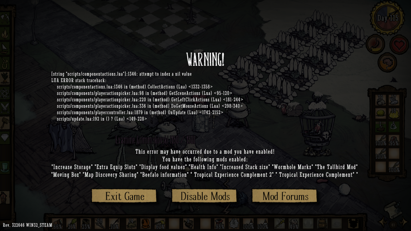 LordWolkenstein Posted April 29, 2019 Share Posted April 29, 2019 Hey guys I'm getting a error/mod warning while playing dst with mods. worked out fine for 200 hoursn now i get the warning after playing in a new world after 80 days. Done: -uninstall -deleted all dst files at documents -disabled all mods i get the same mod warning everytime, doesn't matter if i have mods enabled or don't. Others on the server have no problems Link to comment https://forums.kleientertainment.com/forums/topic/105542-lua-error/ Share on other sites More sharing options...