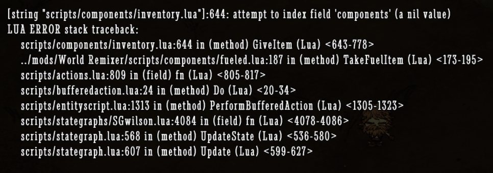 The actions file I'm referring to is under scripts\actions. I am wanting to make an it give the player a specific item whenever a certain fuel is added which I've created. I've tried editing it from the components\fueled and components\fuel side, but it isn't turning out so well. I've tried editing the TakeFuelItem(inst, doer) function in the fueled component to give the player the item by inserting doer.components.inventory:GiveItem(itemname), but for now its only giving me errors which say scripts/components/inventory.lua tried to index field components. I'm hoping that putting this in actions right before TakeFuelItem is called would give better results than inserting it in fueled (where it is called). Would I be able to edit actions in modmain.lua?