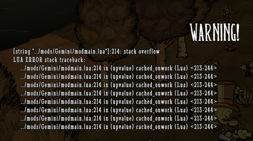 Hmm, it looks like there may be two mods conflicting here. The Gemini code, though it is simple and looks like it should work, is susceptible to producing a stack overflow (as is the case here) if another mod tries to do something similar. In addition, it omits the last parameter of the onwork function, numworks, so it looks like the mod may be out of date. You can fix this easily, by changing the code to: