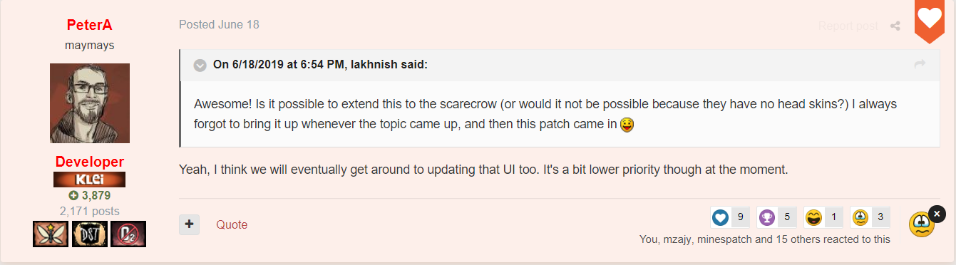 lakhnish Posted July 28, 2019 Share Posted July 28, 2019 As per Peter: Link to comment https://forums.kleientertainment.com/forums/topic/109544-new-screen-for-friendly-scarecrow/#findComment-1234490 Share on other sites More sharing options...