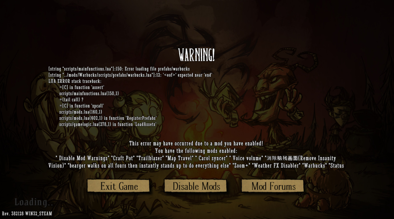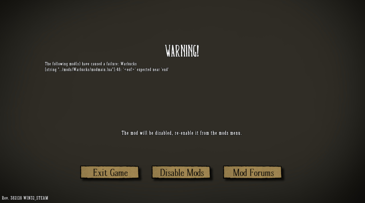 Hornete Posted December 11, 2019 Share Posted December 11, 2019 40 minutes ago, Pinkamena11FazP said: Hm I'm going to try to add it with a "end" at the very bottom to see if this will fix it. client_log.txt Hm Still nothing... This is going to be a pain to find which "end" it needs There's an extra end here, The game is seeing it. And doesn't know why the heck it's there, since it's not ending anything, so the game crashes. Just get rid of it and it'll be fixed. Link to comment https://forums.kleientertainment.com/forums/topic/114172-just-need-to-finish-this-mod-and-this-popped-up/#findComment-1290709 Share on other sites More sharing options...