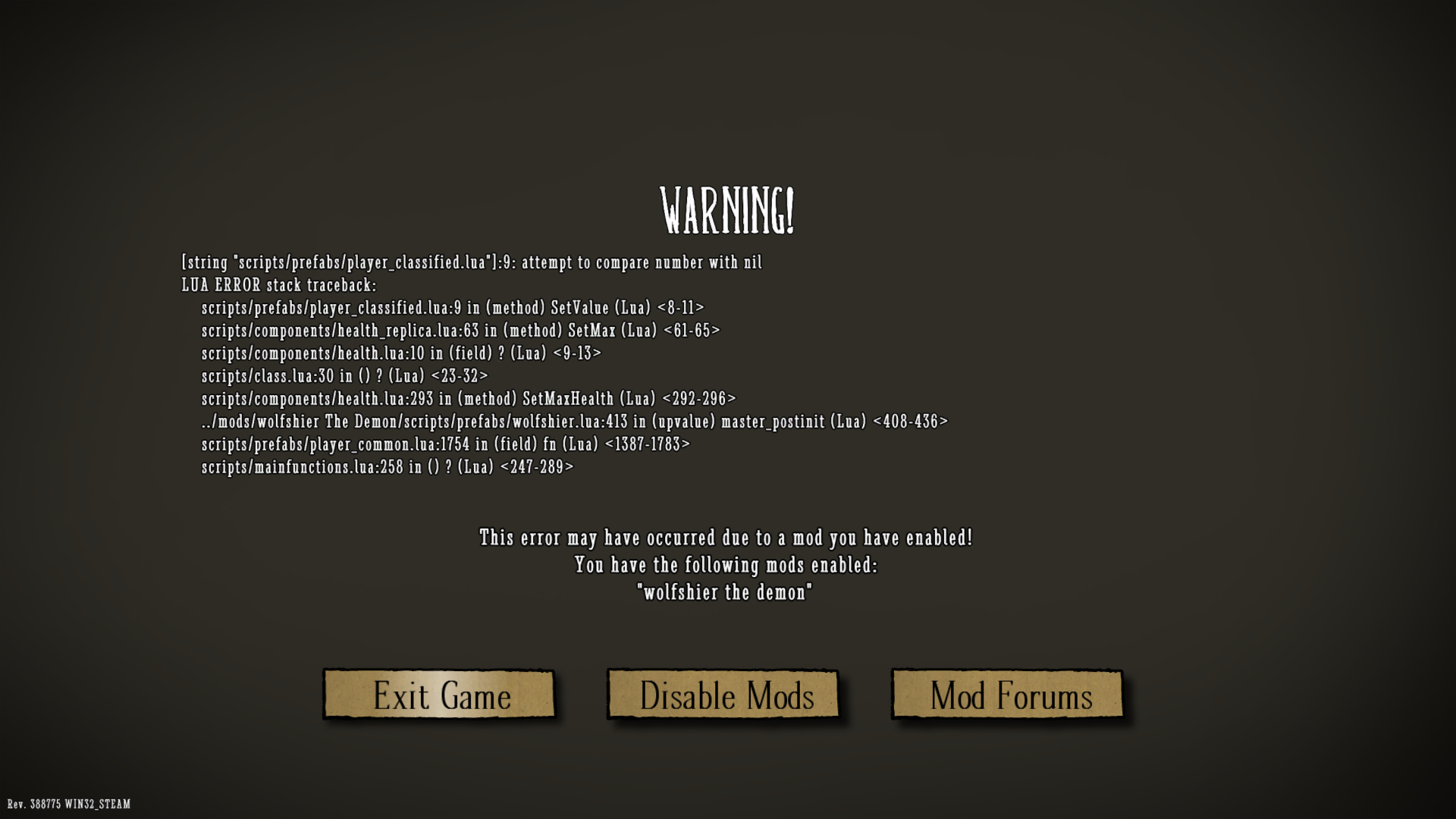 AkaiNight Posted January 18, 2020 Share Posted January 18, 2020 can you upload your log file. it seems like the problem in wolfsier.lua and line 133-148 and 199 for details you should look at log Link to comment https://forums.kleientertainment.com/forums/topic/114907-lua-scripting-help/#findComment-1299792 Share on other sites More sharing options...