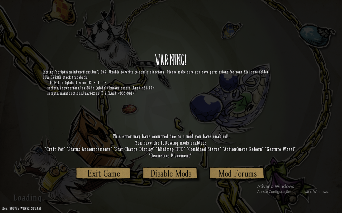 Ultroman Posted January 20, 2020 Share Posted January 20, 2020 Sounds like your Windows user does not have permission to access the DST save folder, which is usually located here: <SystemDrive>:\Users\<USERNAME>\Documents\Klei\DoNotStarveTogether If you have recently relocated your Documents folder, that would be the reason. Otherwise, you may be logged in as a different user than you normally are, or some update has messed up your user permissions. Try going to the folder, see if you have permission to view it. Whatever the case, find out how to add permissions for your user to access specific folders. Link to comment https://forums.kleientertainment.com/forums/topic/115056-lua-error/#findComment-1300159 Share on other sites More sharing options...