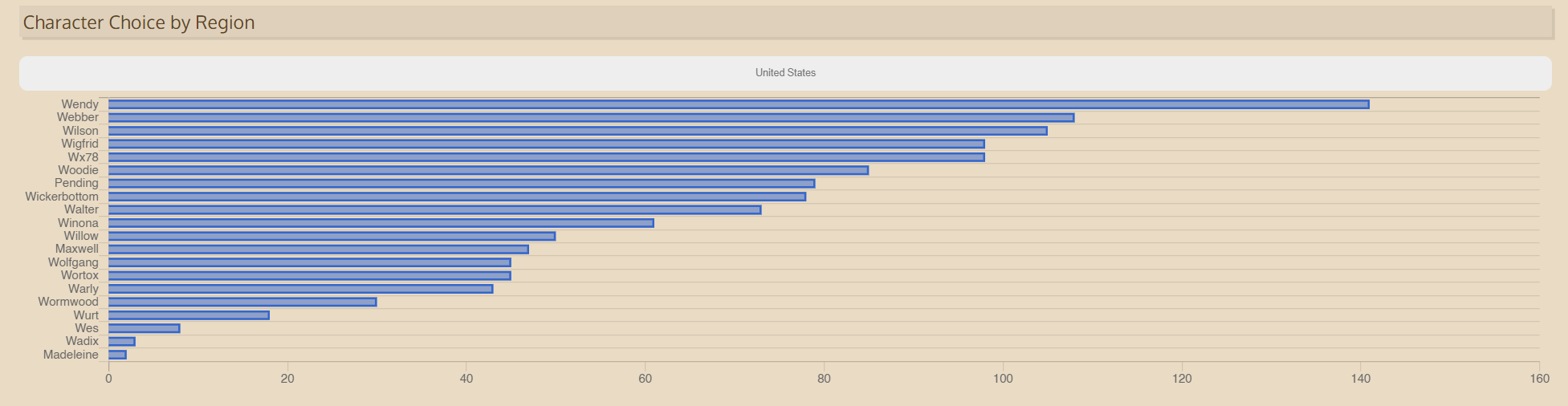 resamvi Posted August 21, 2020 Author Share Posted August 21, 2020 1 hour ago, Hornete said: Pending are people in the Lobby, they haven't chosen their character yet.. I'd assume so atleast given the definition of the word. Correct! 2 hours ago, KainMorgen said: I can't change the region. Is it supposed to be a dropdown? Apart from that it's a very interesting website. I like stats like these. On a sidenote: Who are Wadix and Madeleine? I think custom characters should be excluded from this. Its an input field - you need to type in something first before the options show. Are you on a tablet by any chance? I guess I should filter out some of those modded characters.., Link to comment https://forums.kleientertainment.com/forums/topic/121116-most-used-character-in-total-by-region-and-more-infographic/#findComment-1364919 Share on other sites More sharing options...