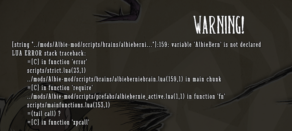 PigGaming Posted September 25, 2020 Author Share Posted September 25, 2020 8 minutes ago, penguin0616 said: @PigGaming Okay, I went ahead and cleared up the code. You'll have to run the new version and get a proper error if you want @Serpens to be able to help you.. Albie-mod.rar 2.45 MB · 0 downloads After running that version the error I'm getting is this. @Serpens Link to comment https://forums.kleientertainment.com/forums/topic/122010-need-help-with-an-error/#findComment-1374686 Share on other sites More sharing options...