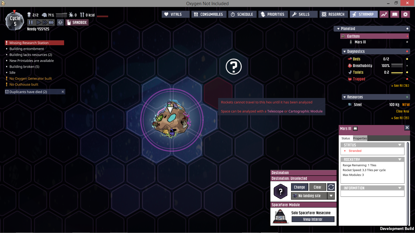 stgo Posted March 14, 2021 Share Posted March 14, 2021 So through the telescope I found a ? tile. I build a rocket that could reach it and since I didn't have any idea on how to provide oxygen I used a large gaz canister for that So cone + canister, command module, 1 oxydize, 2 liquid tank and motor. Which means maximum number of module and no place for cartographic module. I launched it to the ? square and nothing prevented me from doing it. Alas, now my rocket is lost in space without any mean to tell it to got back. The pilot unfortunately died in it (due to unexpected starvation). Is there a way to get my rocket back ? Burgeoning Moonbase.sav Ok, I have it back after a reload ! Link to comment https://forums.kleientertainment.com/forums/topic/127966-lost-rocket/ Share on other sites More sharing options...