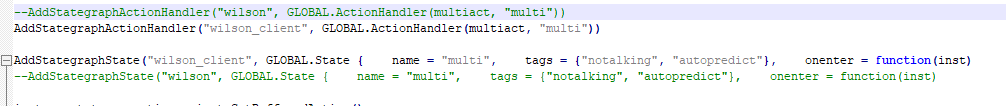 Thank you. That does seem to be what I'm missing, but now I'm having a problem of I can get the actions to occur OR I can have the animation play, but not both. Animation only plays if I also change the AddStategraphState to "wilson_client" but that doesn't work with the actions. Including AddStategraphActionHandler for both "wilson" and "wilson_client" results in neither working.