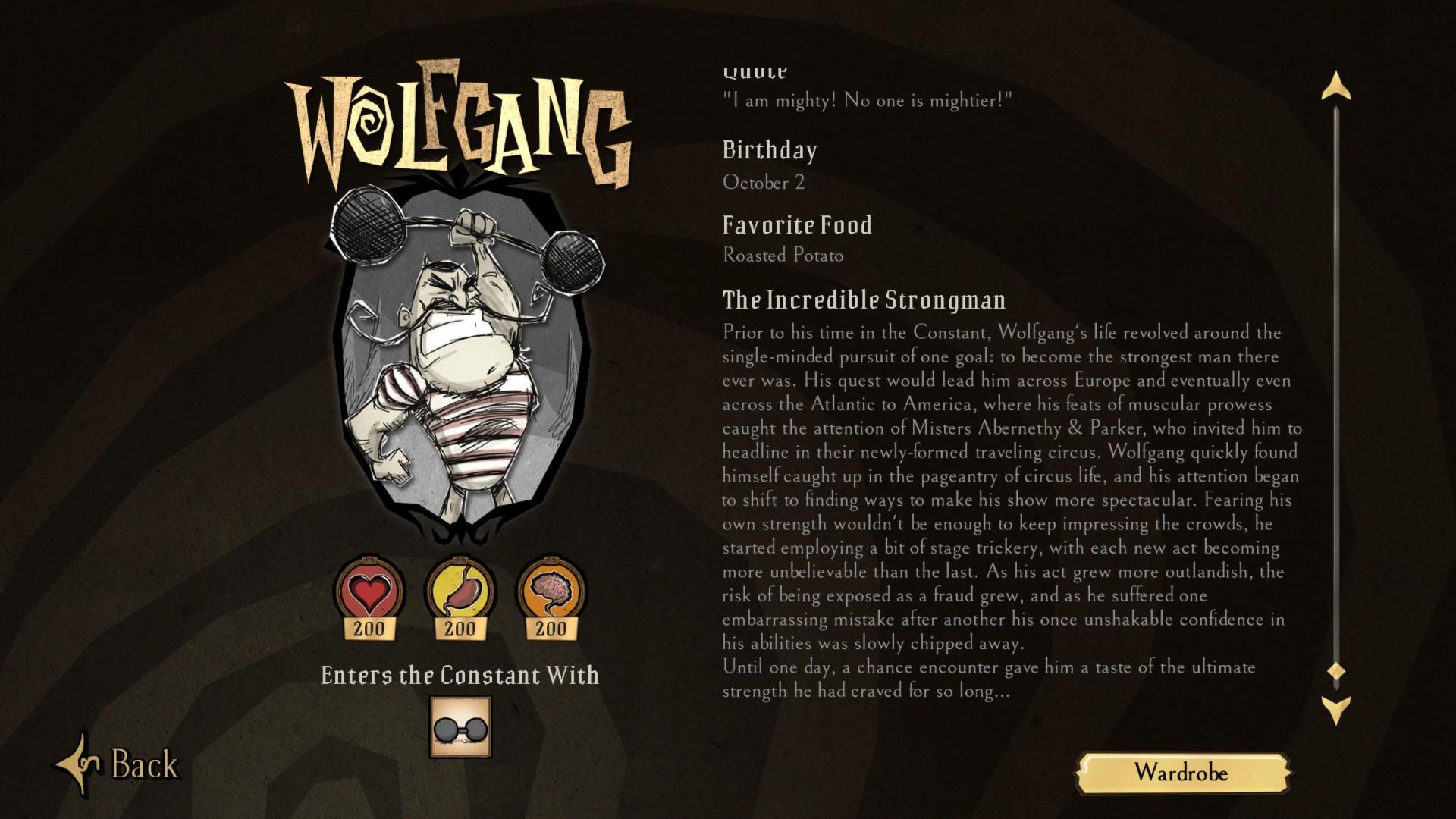 lakhnish Posted December 11, 2021 Author Share Posted December 11, 2021 From the public Wolfgang beta branch: Link to comment https://forums.kleientertainment.com/forums/topic/135962-wolfgang-lore/page/3/#findComment-1520705 Share on other sites More sharing options...