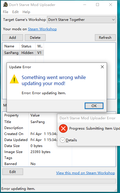 ArckerZ Posted April 2, 2022 Share Posted April 2, 2022 Hi, I just started uploading my first mod with the mod tools for DST, but I keep getting this warning and the data size shows 0 bytes depot_build_322330.log Link to comment https://forums.kleientertainment.com/forums/topic/138815-something-went-wrong-while-updating-my-mod/ Share on other sites More sharing options...