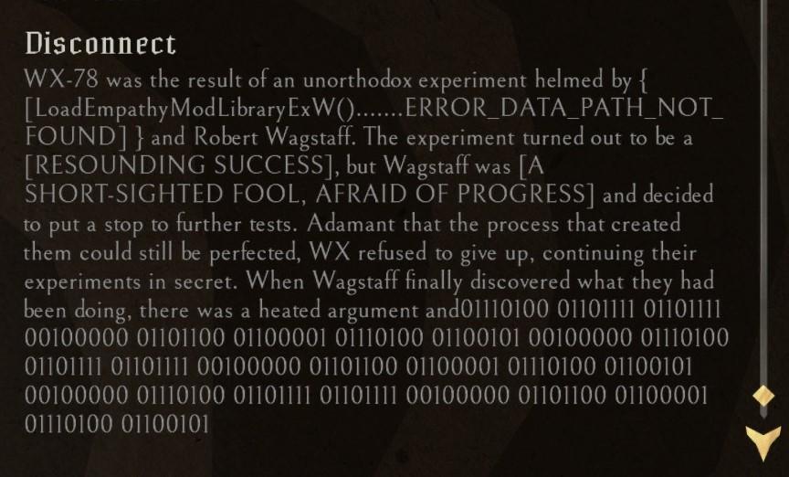 MondayNight Posted April 14, 2022 Share Posted April 14, 2022 The binary spells "too late too late too late" apparently. Also the experiment giving birth to WX seems to be either merging of a human and AI with "cyborg-ification" adjacent process, or enhancement of a human with mechanic & electronic elements via (Constant's) dark magic perhaps - of which Wagstaff was no stranger. It likewise could explain in somewhat scientific, in-game lore vein the "They" plural as parallel consciousnesses/minds resulting from the "cyberification" - aka more than 1 processing unit (in tune with modular components). Link to comment https://forums.kleientertainment.com/forums/topic/139119-wx-lore/#findComment-1557790 Share on other sites More sharing options...