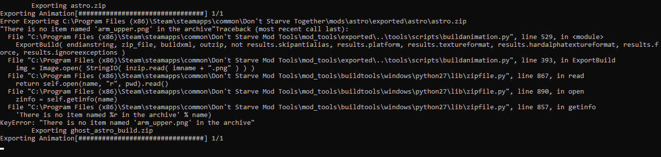 majuck Posted May 4, 2022 Share Posted May 4, 2022 So I've been making a character mod, and for some reason when I wanted to check it in game the auto compiler got an error when it got to the character anim file. (however the other character zip file is just fine) Before that I tried to change the z-order for arm_upper in spriter, so that might've been the cause but I'm unsure since I've already spammed undo a bunch of times ever since I got the error, and it got in it's original order. I've already checked all the folders and nothing's missing, and I'm bad at coding so I can't figure out what's causing this nor how do I fix this. So yeah, I'll be very thankful if someone helps me. Apologies if it's something obvious haha. Link to comment https://forums.kleientertainment.com/forums/topic/139946-an-error-when-running-auto-compiler/ Share on other sites More sharing options...