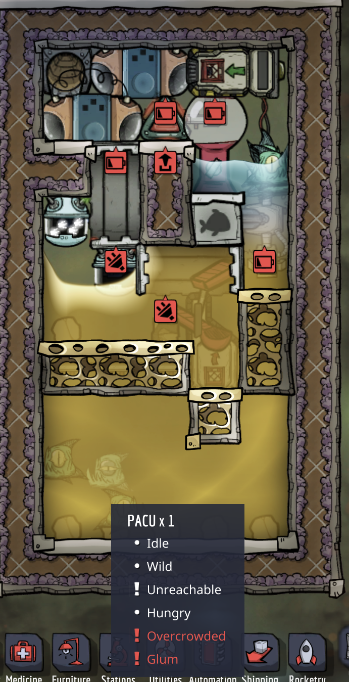 blakemw Posted August 16, 2022 Share Posted August 16, 2022 Pacu space requirements are weird, that's because pacus determine "overcrowded" from the size of the body of liquid they are in, not the size of the room. The body of liquid is simply every connected liquid tile, including liquid tiles inside mesh tiles and doors. They determine "confined" and "cramped" from their room though. Link to comment https://forums.kleientertainment.com/forums/topic/142639-liquid-layers-in-pacu-farm/#findComment-1594449 Share on other sites More sharing options...