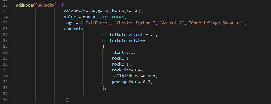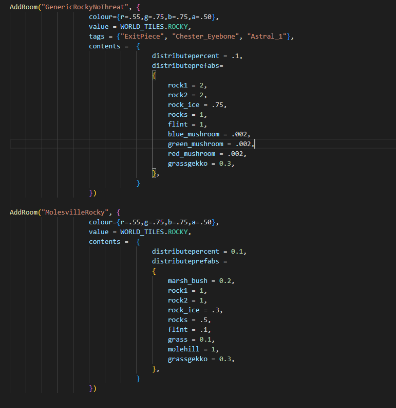 Mr.Oshiro Posted October 9, 2022 Share Posted October 9, 2022 Until now, rocky biomes were too monotonous, with just all kinds of rocks. . .It's easy to get bored while exploring.Usually never comes again after digging all the rocks here. Unless the moonstorm is here. If the grass in this world is mutated, a lot of grassgekkos will spawn here, adding a little variety, but not enough compared to the mosaic terrain "Rocky", where there are meteors and moon rocks. This is the background room of the rocky terrain.As you can see from this graph, the parameter for the tallbirdnest is very low (only 0.008), which means that it is difficult to find it in a wide rocky field. Can you increase the spawn parameters for tall bird nests? I think in a place with so many ore resources, some threat is still necessary. Meteor and Moon Rock should also be added here, making it still necessary for players to explore here later in the game. ( Mole Colony Rocks ) "Mole Colony Rocks" in particular, has almost no features except for a few vultures.Added two mole-themed biomes to the RoG DLC, deciduous and rocks. I'm not sure why rocky terrain was chosen as a dedicated biome for moles, but molehills are not allowed to spawn on rocky turf? ? ? "GenericRockyNoThreat"(So normal rocky biomes should be threatening) and "MolesvilleRocky" are both part of "Mole Colony Rocks",but none of the three types of mushrooms, spiky bushes, grasses, and molehills can spawn on rocky turf.This causes their characteristics to disappear, and they are basically indistinguishable from BGRocky biome. Can you change this terrain?I hope it has some character. Link to comment https://forums.kleientertainment.com/forums/topic/143691-rocky-biomes-require-qol-update/ Share on other sites More sharing options...