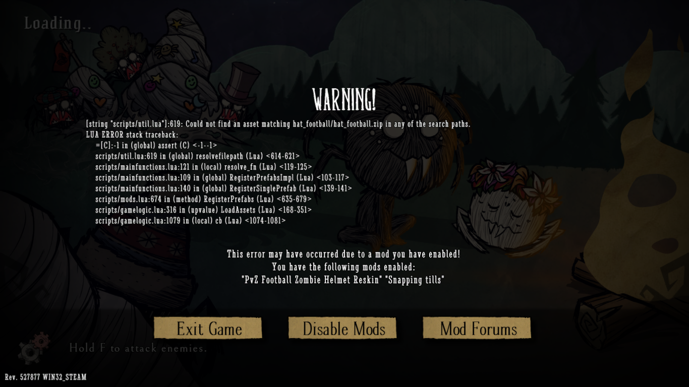 HeavenHeathen Posted October 25, 2022 Share Posted October 25, 2022 Hi! I'm new to modding and I've decided to make a reskin mod by another person's suggestion. This mod changes the texture of the football helmet icon, but it doesn't seem to work. I've put together all the standard mod files together, in addition to the changed texture so the autocompiler can compile it, but after viewing the item in-game, the texture didn't change (also, the mod icon doesn't show up). I don't know how to write code to enable my texture, so I looked up on the forums and added a couple of lines of code to the modmain.lua file and now it crashes upon trying to launch my world with my mod enabled. . DST PvZ football helmet Reskin.rar Link to comment https://forums.kleientertainment.com/forums/topic/144068-my-reskin-mod-not-showing-changed-texture-and-crashing/ Share on other sites More sharing options...