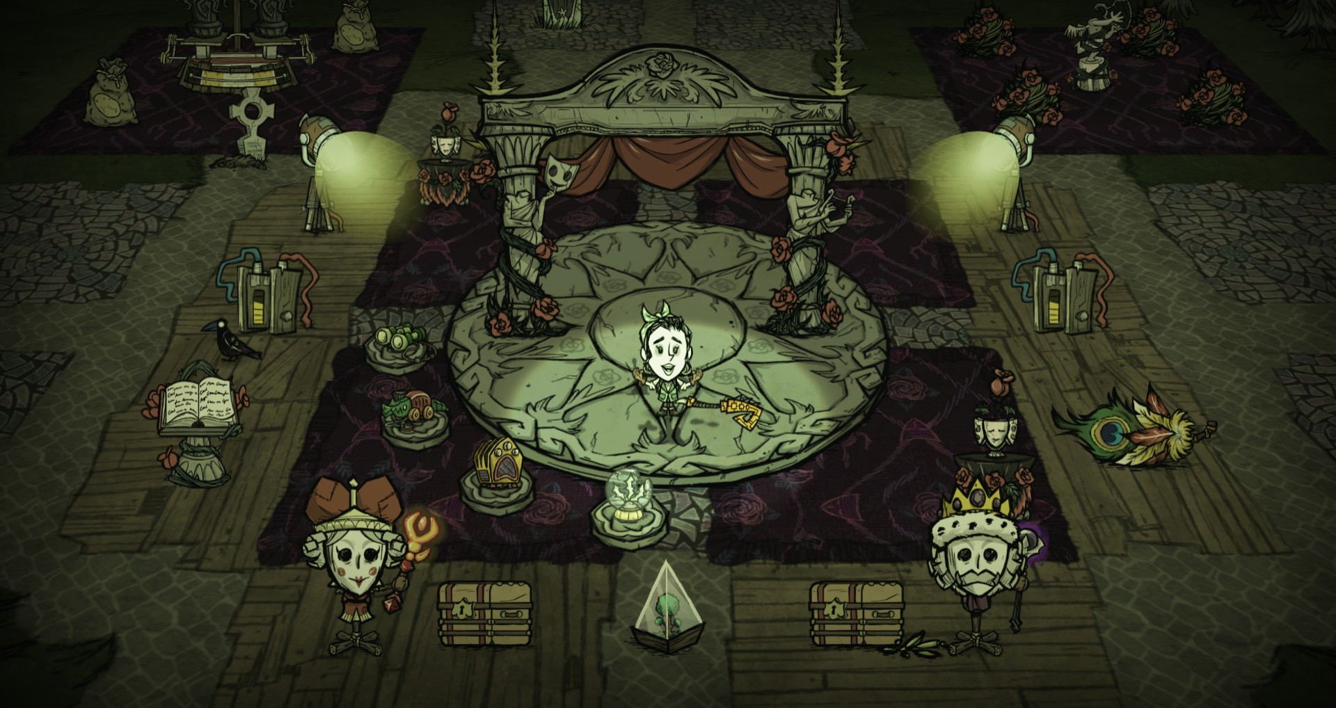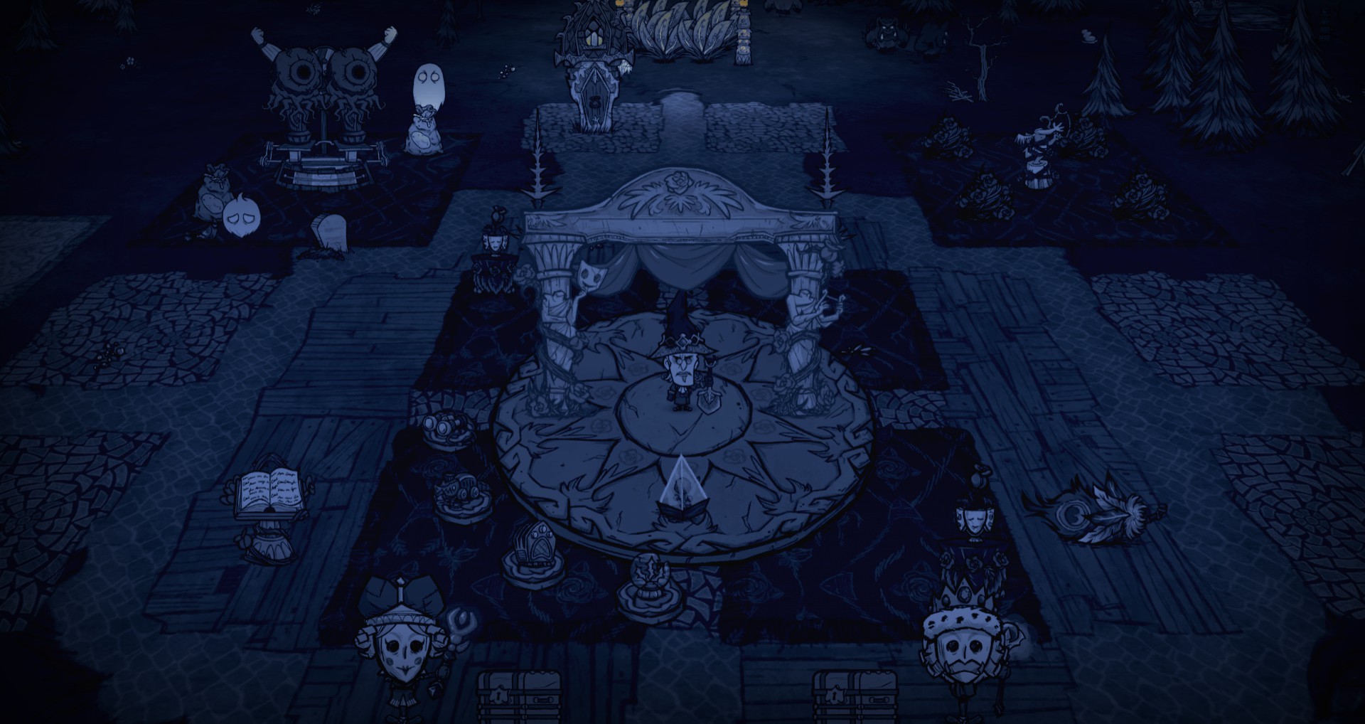 MrMNWorm Posted December 2, 2022 Share Posted December 2, 2022 Hello Everyone, Hope everyone is enjoying the Maxwell update, I know I am. I've been working on a Maxwell Base that is located around a Stage setpiece AND has a Guardian Pig Terraria setpiece located right behind it. There's also a little Pond that makes for a useful, all-natural food-farming area since the pigs will often war with the frogs... leaving behind fresh snacks. Recently Winona stopped by to add some spotlights for when we're performing on the Stage. The extra lighting is really nice... because... well... it gets a little spooky if you're around the Stage late at night... by yourself. Does anyone else get the feeling that the Stages are... haunted? I swear... sometimes... when it's dark out... I can hear these bone-chilling, ghostly wails coming from the stage area. And if you're there during a full moon... the ghostly wailing gets worse... and beastly howls can be heard in the distance. (shutters with fright.. shakes it off) Still no idea how or where it's coming from... But other than that, it's a pretty cute and super fun base to play in! Usually I play solo but this base has been public from Day 1 and the funniest thing happened. My first Spring these two Wendys popped in to play... kinda like a pair of twins. One was very adventurous and out-going, kinda like Abigail. She built a boat and went sailing out in the dangerous oceans almost immediately. The other was a little more reserved but very kind, kinda like Wendy. She would hang around the main base area to collect all the food and make sure the fridges were stocked with fresh meatballs. At the end of our first adventure together we took photos by the main firepit and I gotta say... it kinda reminded me of Uncle Maxwell hanging out with his Twin Nieces, Wendy and Abigail. If you squint a little and use your imagination... you might see it too. Please enjoy the photos and may the Gods of Science and Magic bless your World Gen! DST Hugs and Kisses, MrWorm Link to comment https://forums.kleientertainment.com/forums/topic/145012-are-the-stage-setpieces-haunted/ Share on other sites More sharing options...