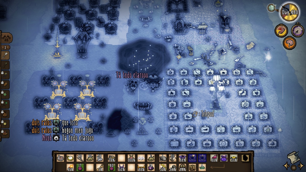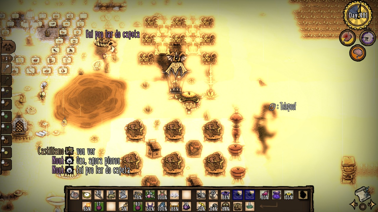 dois raios Posted December 7, 2022 Share Posted December 7, 2022 Hi guys, sunday I was playing with some friends, I was using wanda and one of my friends wicker, then we went to waterlogged biome to get some figs using horticulture book, after that I put 1 purple gem in the backtreck watch and we went back to base, then things got strange, see images below. (also, my map got deleted after that) If this ever happened to anyone, pls share if you know how to reproduce, because I dont know how to reproduce yet. thx for the attention Link to comment https://forums.kleientertainment.com/forums/topic/145083-i-want-to-post-in-bug-tracker-but-i-dont-know-how-to-reproduce/ Share on other sites More sharing options...
