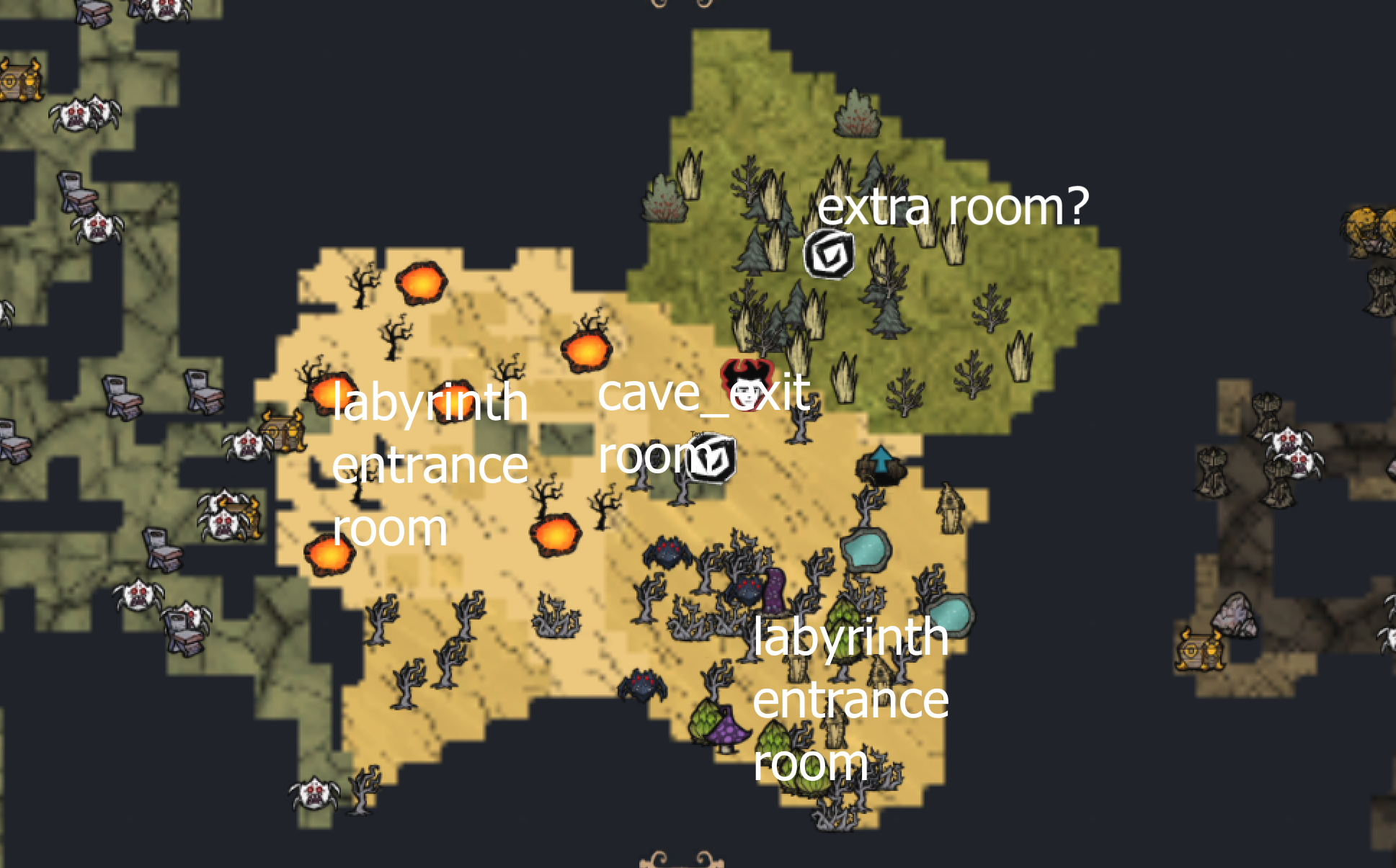 I've been trying to do a minimalist cave map with just three main rooms: an exit room, a labyrinth, and an atrium (the bottom room is mis-labeled, it's supposed to be the atrium entrance room). But worldgen keeps on throwing in an extra room, the one to the top right. I thought it was because I must include a spawnpoint_master and a multiplayer_portal, but after including those the worldgen still spawned one in. Does anyone know why it's doing this?