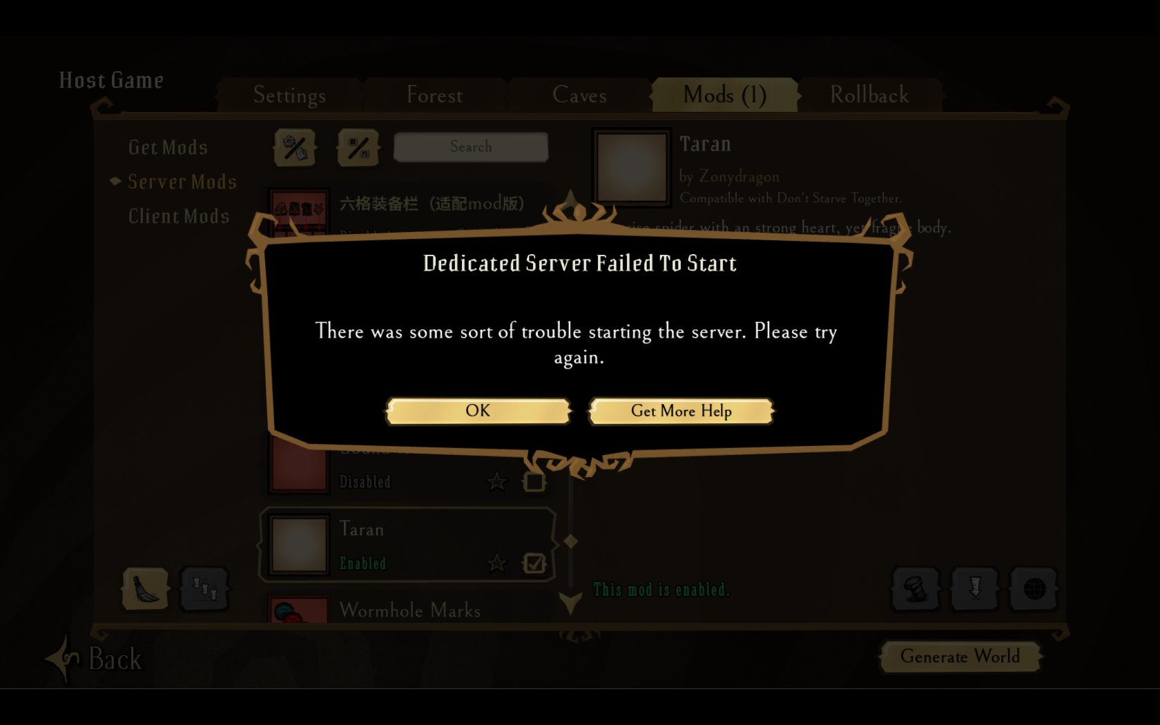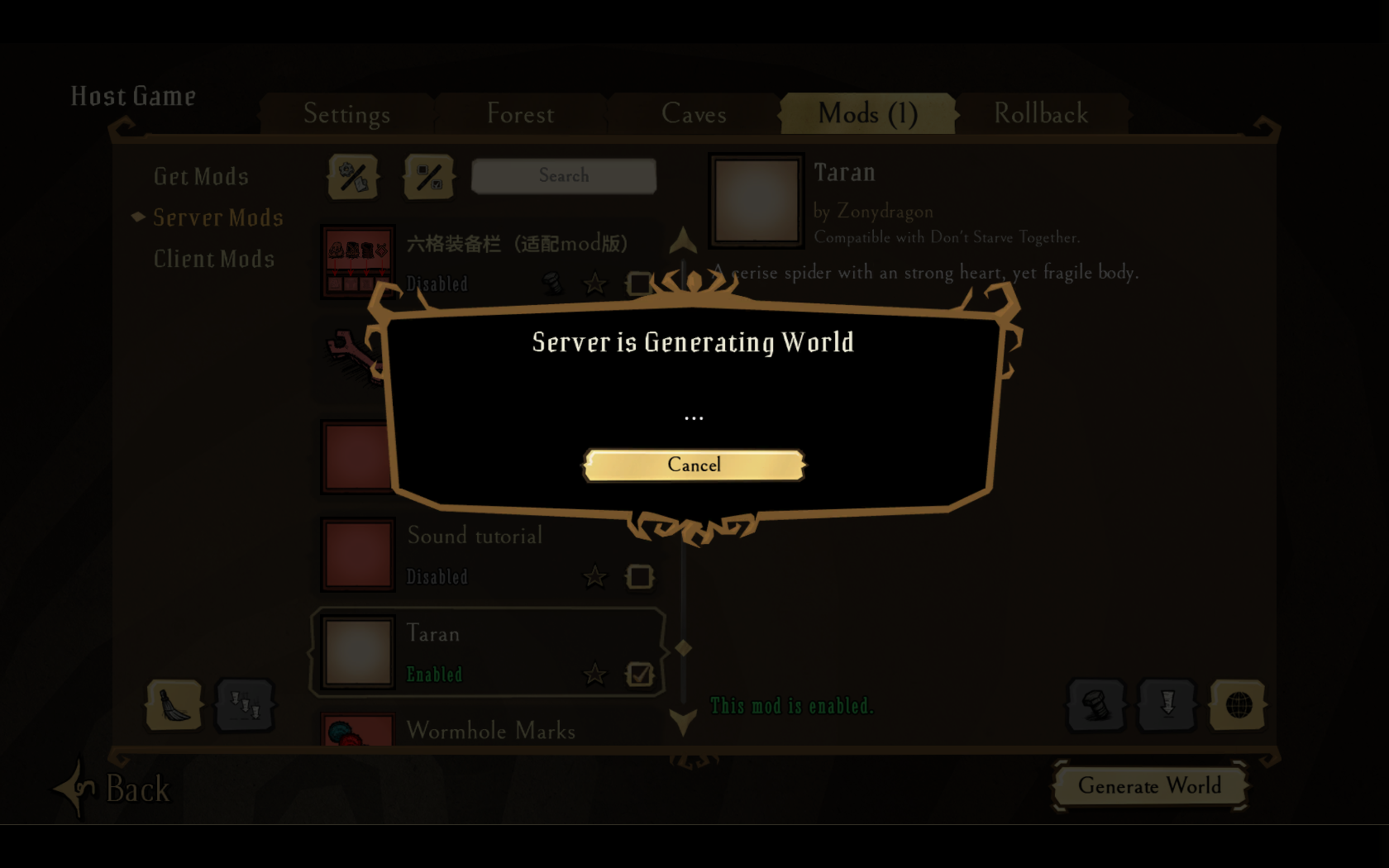 I put it in modmain.lua and removed the extra ), the error is gone but now every time I try to enter my server with the mod it just says "Server is generating world" forever. It literally won't stop loading no matter how long I wait.