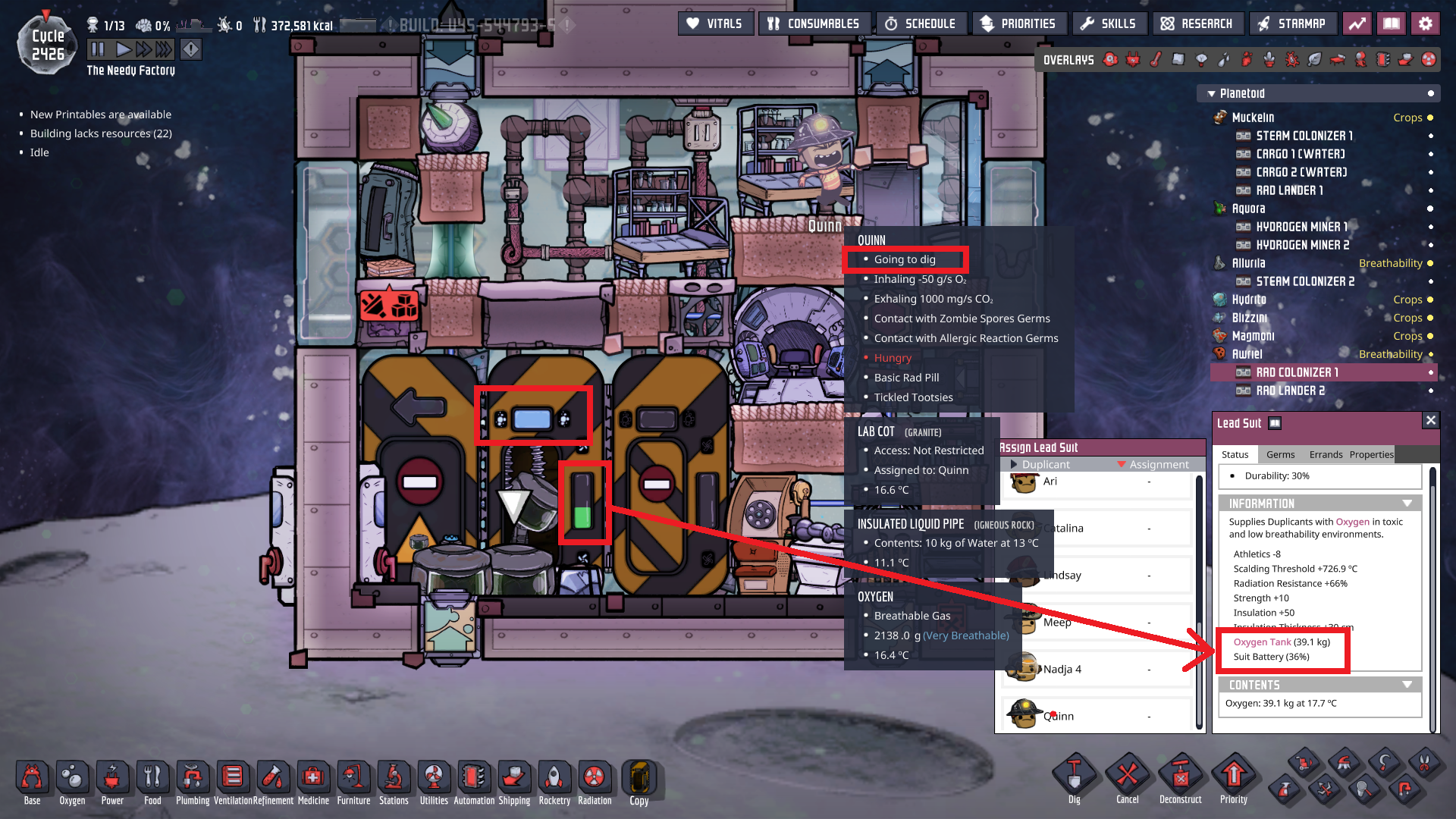 NeoDeusMachina Posted March 1, 2023 Share Posted March 1, 2023 I have been using lead suits a lot, for everything, even in rockets. Those who also use them probably noticed that lead suits have 2 resources: oxygen and power (internal battery). Dupes have to run back and dock the lead suit when either O2 runs low, or battery runs low. The problem is that right now, the threshold for minimum amount of oxygen in the suit before dupes are allowed to equip the suit and go out to work is much larger than the threshold for internal battery (around 33% battery charge). This leads to annoying scenarios where the lead suit is full of oxygen but very low on power. Dupes put the suit on, go out with the intention of doing an errand, then have to do a 180 and go back to recharge the lead suit before doing any work because the internal battery is too low. This is particularly problematic if you have dupes that have a low oxygen consumption, e.g., from the diver's lung or deep diver's lung trait, or if the task they are doing is far from the docks or take a while to do, like digging hard tiles. Image below, example of Quinn leaving the rocket when the internal battery is still low but the oxygen is full. Spoiler My suggestion: teach dupes patience. Increase the threshold (minimum charge on the internal battery) to a higher value, so that dupes wait for suits to be both nearly full of oxygen and also for the internal battery to be nearly full. Alternatively, add a setting to docks so that those threshold can be adjusted by the player individually (all types of suits, masks, etc.). Link to comment https://forums.kleientertainment.com/forums/topic/146246-dupes-going-out-with-lead-suit-on-low-battery-teach-them-the-virtue-of-patience-please/ Share on other sites More sharing options...