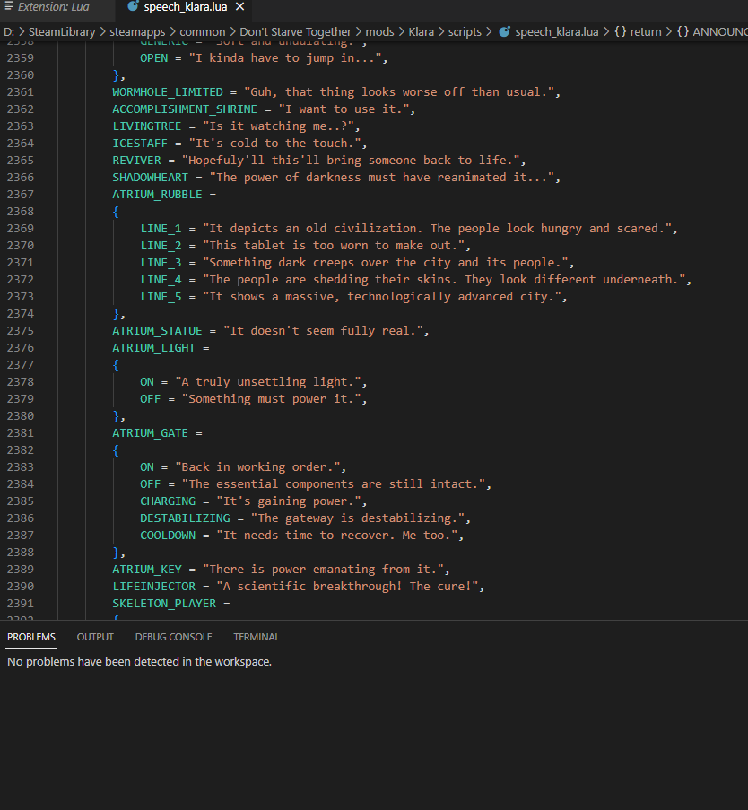 Rickzzs Posted March 21, 2023 Share Posted March 21, 2023 (edited) Make sure you've enabled Lua extension (either version is OK, but the problems displayed may vary), and then format document. The format command can be found by ctrl+shift+p (this shortcut opens command panel). And your speech_klara is now fully correct. The picture attached is what it will look like if there are problems. Edited March 21, 2023 by Rickzzs Link to comment https://forums.kleientertainment.com/forums/topic/146652-my-speech-thing-keeps-crashing-the-game-and-looking-at-the-crash-logs-really-confuses-me/#findComment-1626611 Share on other sites More sharing options...