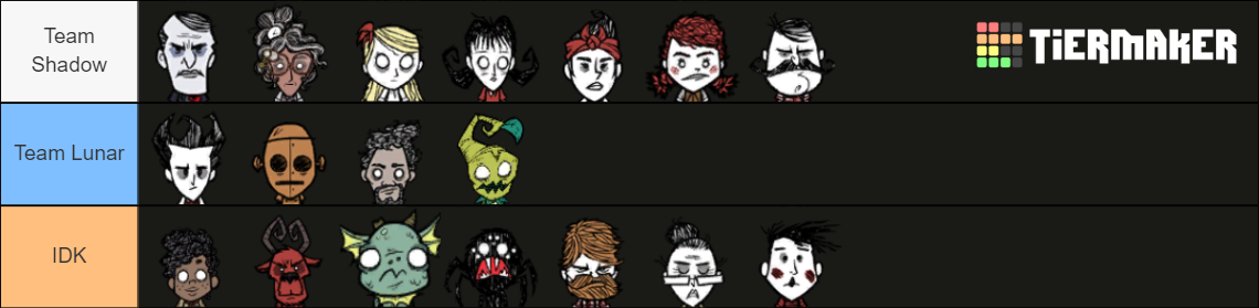 Garett Skott Posted May 5, 2023 Share Posted May 5, 2023 My teams: Shadow: Maxwell - because yes Wes - because why not Wendy - suits the mournful girl obsessed with death Webber - his spider part might suggest this team Wanda - I doubt she'd want to give up her power Lunar: Wilson - has already helped Wagstaff Willow - hates darkness (and also has a BODYGUARD against it) Wolfgang - hopefully not afraid of the light WX-78 - "MOONBASE. AAAAA. MOONBASE!" Woodie - finally accepted his curse Wigfrid - I'll trust Hornete on this one Winona - looking for a way to counteract Charlie's corruption Warly - Idk, he just feels like a lunatic Wormwood - definitely a lunatic Uncertain: Wickerbotton - has shown interest in both fields Walter - too ignorant to care Wortox - is technically an outsider Wurt - merms are only related to the Gnaw Link to comment https://forums.kleientertainment.com/forums/topic/147619-which-side-do-you-think-the-survivors-will-take/#findComment-1633681 Share on other sites More sharing options...