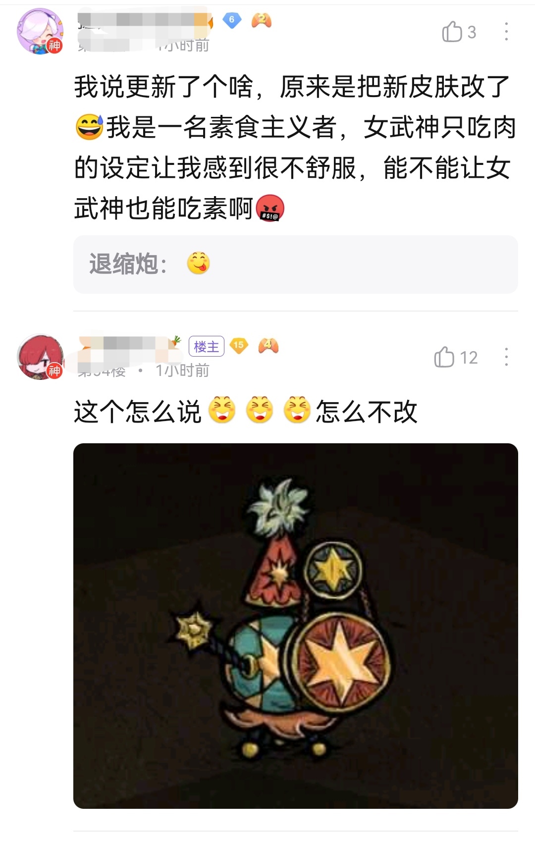 goatt Posted June 29, 2023 Share Posted June 29, 2023 51 minutes ago, NOOOBU said: 但是艺术创作显然不是这么简单的问题 颜色的选择,其它的部件,以及总体的风格部分的创作全都已经定下了并且发表出来了,只是为了修改一下不合适的部分而已。这次的艺术创作的空间本来就不大。再说,我只是说这样顺从那个帖子算是合理,他们具体的创作过程,我只是玩家,又怎么知道。 56 minutes ago, NOOOBU said: 设计稿会如此雷同 雷同啊,很像啊,我说了是的啊,没说不像啊。根本就是差不多嘛。理由也很充分啊。理由点击这里。这本来就是月神方的饰品嘛。又不是创新设计。只是告诉Klei沿用Klei自己以前的设计而已。 58 minutes ago, NOOOBU said: 言止于此,道不同不相为谋。 别啊,道理越说越明。我又没有强词夺理。不过你想退出我也不拦你。 1 hour ago, ieeecim said: 几个客观事实: 一.犹太人提出意见并给出了草稿 二.1.在犹太人提出意见后klei修改了设计、修改方向和犹太人的意见相同 2.女武神新设计与犹太人提出的草稿相同 你和 @NOOOBU 的说法差不多,我就不重复说了。请看我的本次回帖的上半部分。 Link to comment https://forums.kleientertainment.com/forums/topic/148812-content-warning-i-hope-klei-can-explain-what-is%E2%80%9Cour-chinese-community-are-largely-supportive%E2%80%9D/page/6/#findComment-1644417 Share on other sites More sharing options...