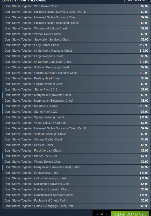 Cheggf Posted July 24, 2023 Share Posted July 24, 2023 4 hours ago, lenship2 said: omg i didnt know the item cosmetics were actually necessary to play the game!! klei is such an evil company for this, they could at least add a way to get one of the skins randomly every day instead of forcing us to pay 354 dollars to play the game :c So you're telling me that Klei is scamming innocent buyers who don't know better into spending $400 for no reason on worthless things you can get for free? That's even worse than I thought. I had just thought that they were like every other gaming company out there, I had no idea they were outright evil! Thank you for bringing this to my attention. 1 hour ago, -Variant said: Nothing in this screenshot can be bought to provide an advantage over other players. This also applies to characters, those of which you can obtain for free, as I have done in the past. Moving the goalposts is gamers' go-to move when they realize they're wrong. Nobody said anything about advantages (even though the DLC characters do have them). Link to comment https://forums.kleientertainment.com/forums/topic/149665-planar-dmg-changes-the-idea-of-relevant-at-all-times-with-fighting-gear/#findComment-1654037 Share on other sites More sharing options...