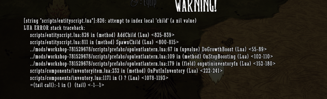 Ghosthic Posted June 9, 2024 Share Posted June 9, 2024 (edited) I have a lantern mod and the lantern can grow crops up with its light. But the game suddenly crashed recently when I held the lantern nearby crops farm. Can anyone help me to fix this? I very appreciate that :'( opulentlantern1.lua Edited June 9, 2024 by Ghosthic Link to comment https://forums.kleientertainment.com/forums/topic/156805-mod-crashed/ Share on other sites More sharing options...