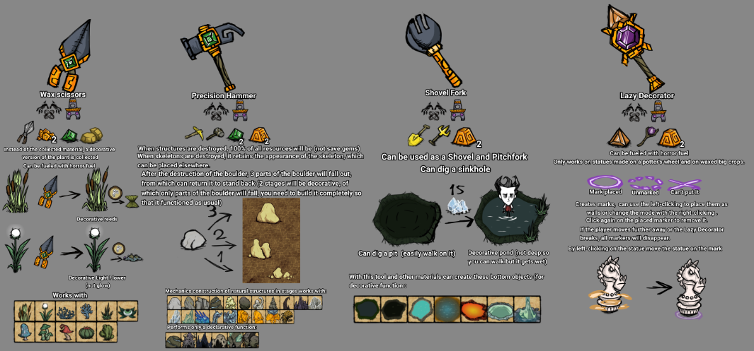 Milanjorim Posted August 14, 2024 Author Share Posted August 14, 2024 3 hours ago, Creatingabe1125 said: Мне нравятся инструменты, но у меня есть несколько вопросов и вещей, которые я хочу сказать. Будет ли новое ремесло ножниц или вы используете бритву для резца по воску? Резак по воску превращает растение в декоративное растение, пригодное для выкапывания, или как это работает, потому что я не понимаю, как это работает? Я думаю, что молоток можно использовать для добычи камней, чтобы сделать их декоративными, и использовать эти куски камня либо для ремонта декоративных камней, либо для использования в качестве украшения, я прав? Также я думаю, что молотку понадобится по крайней мере немного кошмарного топлива в ремесле, чтобы полностью вернуть материалы, такие как посох. И у меня была идея сделать пруд, только это было бы умением для Вурт, и она могла бы заселить его лягушками и спать в прудах, но не знаю, как Вурт делает пруды. И должен быть способ убрать декоративные пруды, иначе его можно было бы использовать для скорби или совершения ошибки, о которой вы пожалеете (но я сомневаюсь, что кто-то пойдет в руины в новом мире только для того, чтобы кого-то скорбеть). Кроме того, любые корабли, которые можно заправлять, должны также заправляться кошмарным топливом, поскольку для его создания не требуется чистый ужас, а для руин он был бы слишком экстремальным. Lol I forgot that the garden shears are on my other picture with concepts that I didn't post It's like when pick a red mushroom instead of a red mushroom that can eat, but with scissors pick a decorative copy of the mushroom that can plant and use as decoration I hope I explained it normal You are right about the stones. Yes, it was necessary to add horror fuel to the craft, since it is necessary for the green gem to work I think to remove decorative ponds need to use a shovel or pitchfork several times to fill them with dirt. Ye, needed to add some horror fuel For Wax Scissors ,Precision Hammer and Lazy Decorator Link to comment https://forums.kleientertainment.com/forums/topic/159034-thulecite-tools-for-decorative-things/#findComment-1740745 Share on other sites More sharing options...