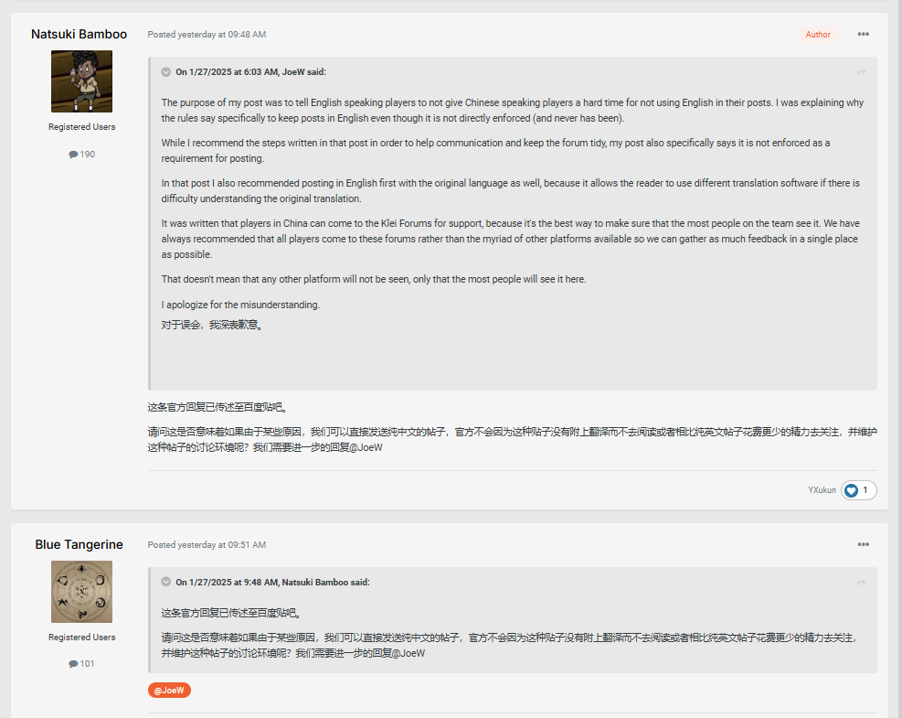 yyyyyyyyyyyyyyy Posted January 28, 2025 Share Posted January 28, 2025 18 minutes ago, Danila6300 said: Под словами "поддерживать язык" вы имели ввиду может ли пользователь писать на том или ином языке также свободно или спокойно как и на английском? Ещё хочу сообщить что у меня переводчик может ошибаться.Например вместо игровой компании "Klei" он написал страну "Корея". 目前问题的关键就在于,哪怕是科雷内部都不能对“支持某种语言”有一个明确的定义,在科雷娱乐的哔哩哔哩账号发布的每月交流帖里,一个所有人都使用中文交流的社区里,运营人员跟我们强调“论坛一直支持中文”,但是没有进一步的解释说明,而论坛的管理员Joew说论坛没有直接支持其他语言的工作人员,并且建议翻译成英文来发帖,显然这两种说法有着明显的冲突,所以这就是为什么我一直想要一个简明且肯定的答复,我们当然无意违反获破坏论坛的规则,我们当然自愿的遵守规则,而前提是真的有明确的规则,我个人想要的仅此而已,我想弄明白关于“支持某种语言”的相关规则到底是什么样的,而解释权完全在科雷 语言间的壁垒固然客观存在,我的回复也不一定传达准确,但我感谢您的理解,我这里现在是中国农历正月初一的凌晨,祝您新年快乐 "The key issue at the moment is that even internally at Klei, there is no clear definition of what it means to 'support a certain language.' In a community where everyone communicates in Chinese, on Klei Entertainment's Bilibili account's monthly communication posts, the operators emphasize that 'the forum has always supported Chinese,' but there is no further explanation. Meanwhile, the forum administrator Joew mentioned that there are no staff members directly supporting other languages and suggested translating posts into English, which obviously presents a clear contradiction between the two statements. This is why I have been seeking a concise and definitive answer. We certainly have no intention of violating or disrupting the forum rules, and we are willing to adhere to the rules, provided that there are indeed clear rules in place. What I personally want is just that; I want to understand what the relevant rules regarding 'supporting a certain language' actually are, and the authority to explain this rests entirely with Klei. The barriers between languages certainly exist objectively, and my reply may not convey accuracy, but I appreciate your understanding. It is currently the early morning of the first day of the Chinese lunar new year for me, and I wish you a happy new year." Link to comment https://forums.kleientertainment.com/forums/topic/163473-%E6%89%80%E4%BB%A5%E5%AE%98%E6%96%B9%E6%98%AF%E9%BB%98%E8%AE%A4%E4%BA%86%E7%BA%AF%E4%B8%AD%E6%96%87%E8%B4%B4%E5%9C%A8%E8%AE%BA%E5%9D%9B%E5%B0%86%E6%97%A0%E6%B3%95%E5%BE%97%E5%88%B0%E5%90%8C%E8%8B%B1%E6%96%87%E8%B4%B4%E5%90%8C%E6%A0%B7%E7%9A%84%E5%85%B3%E6%B3%A8%E5%92%8C%E7%BB%B4%E6%8A%A4%E5%90%97/page/3/#findComment-1790572 Share on other sites More sharing options...