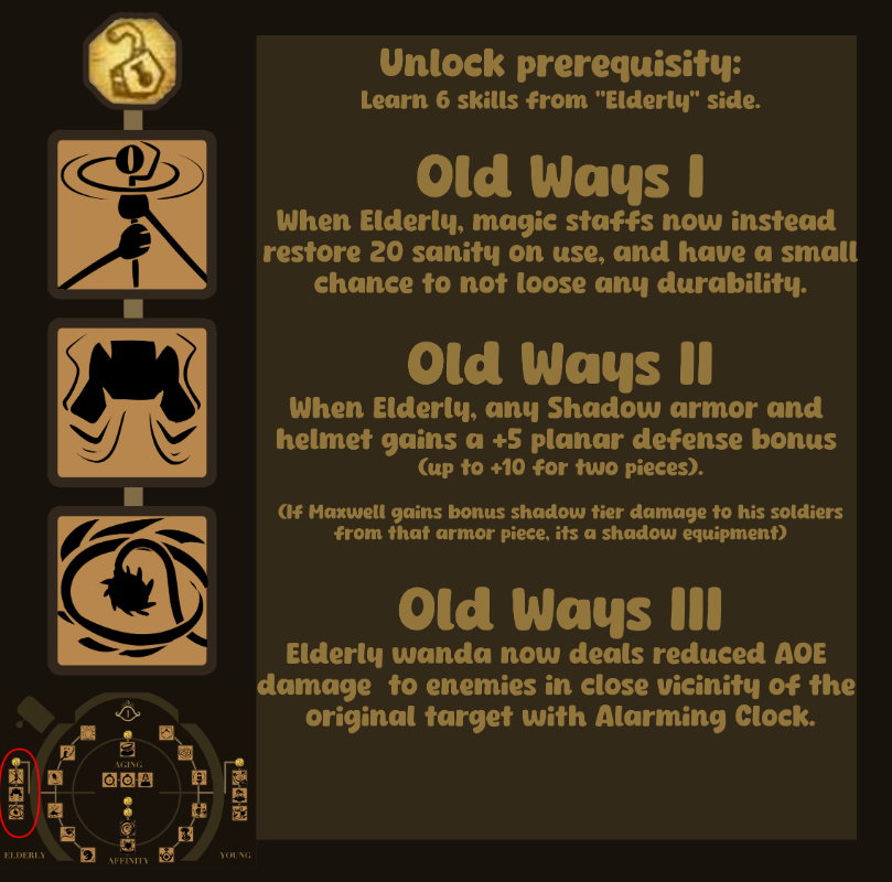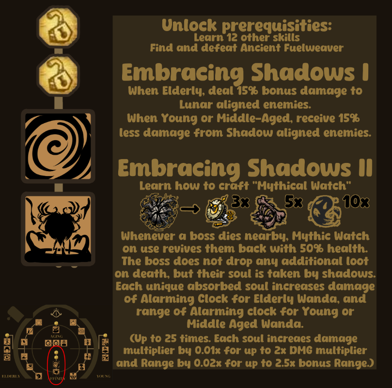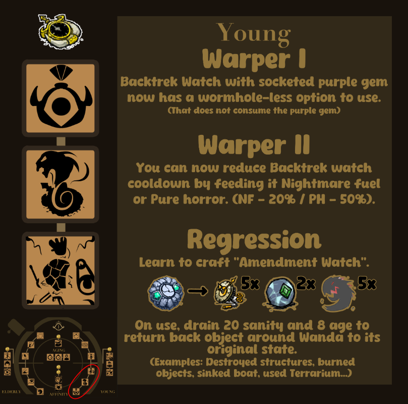 Creatingabe1125 Posted February 17, 2025 Share Posted February 17, 2025 May I ask why there is no lunar affinity? Also why do all the new watches except the shadow affinity watch use pure horror? Though I like the visual design of the skill tree and watches. Link to comment https://forums.kleientertainment.com/forums/topic/163852-my-wanda-skill-tree-idea-c/#findComment-1798639 Share on other sites More sharing options...