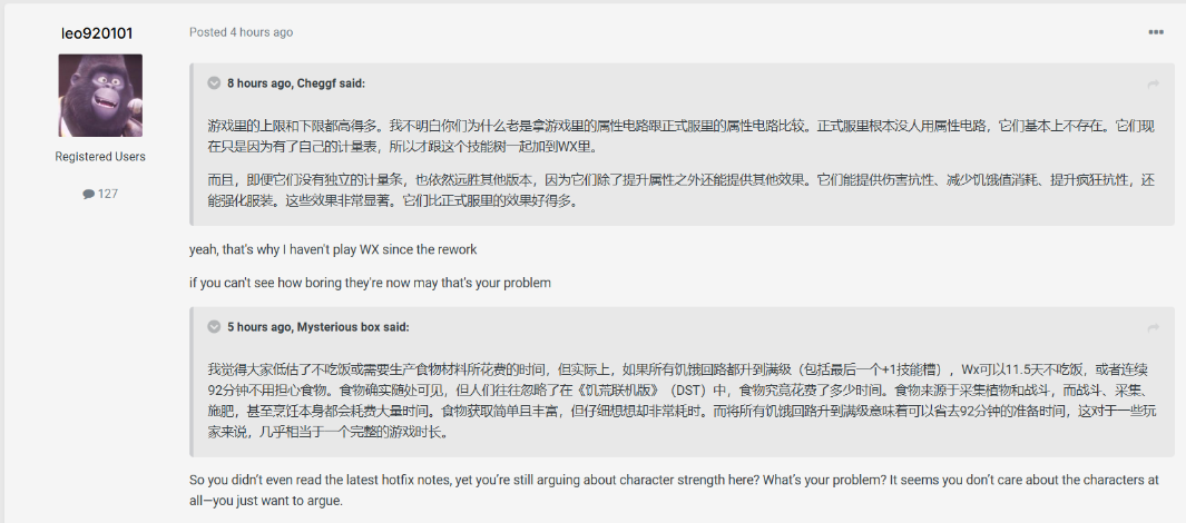 Mysterious box Posted April 6 Share Posted April 6 3 hours ago, leo920101 said: So you didn’t even read the latest hotfix notes, yet you’re still arguing about character strength here? What’s your problem? It seems you don’t care about the characters at all—you just want to argue. I did read the patch notes and retested the circuit and what I got was around a remaining 60 hunger left after 11 days. My point being made was people were underestimating how useful the hunger circuit can be which I then went into why. So I have to ask what is your problem here? You didn't even engage with what I was talking about and just decided to argue around me and make a baseless claim. Link to comment https://forums.kleientertainment.com/forums/topic/170542-wx78-please-raise-the-floor-dont-lower-the-ceiling/page/2/#findComment-1858692 Share on other sites More sharing options...