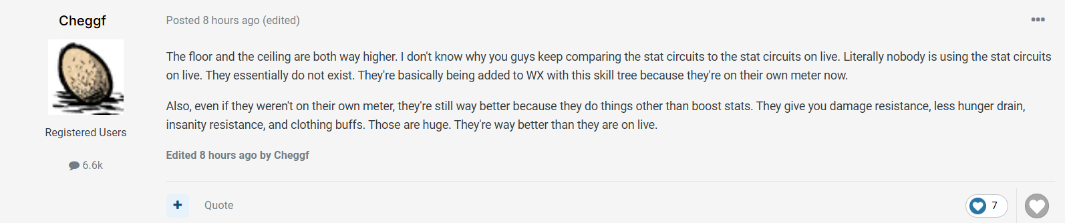 Jakepeng99 Posted April 6 Share Posted April 6 (edited) 1 hour ago, ArcAngela said: WX-78's gimmick is scaling, just like Wormwood's gimmick is blooming and farming, just like any other survivor has their own gimmick. The fact we are pointlessly arguing that this character shouldn't be strong because their unique scaling enables unique abilities that no other survivor has is just laughably missing the point of the character. It’s built your own character like you said. He isn’t meant to scale to bypass every character. Him getting new circuits is the exact same as any character getting new tools, or being able to use more of their perks. Im not sure why you think that after having your circuits you should be better than every other character? All the recent characters seem aimed to be designed to have scaling be a downside not an upside, . When Wanda starts off, she is pretty bad. She needs to work to get her useful items to utilise her perks well, and she is one of the best characters in the games, though she doesn’t surpass her pears or anything. This is just her getting to a comfortable level, the alarming clock is op though she still needs a little more. Her scaling though is very short term, so using scaling to justify her power isnt so fair when it’s easy to get out that weak state. WX can get enough circuits pretty easily. Just like Wanda, it often involves a ruins trip though this isn’t nessisary and can be avoided. The only character who can scale like this is Wurt, and for her, it’s a badly designed aspect for her. She just ends up making the game feel boring with all her power. She has always had that issue. I heard Winona is similar but I haven’t played her lately game enough. Edited April 6 by Jakepeng99 Link to comment https://forums.kleientertainment.com/forums/topic/170542-wx78-please-raise-the-floor-dont-lower-the-ceiling/page/2/#findComment-1858751 Share on other sites More sharing options...