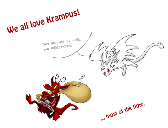 Krampus should require less naughtiness. Also, there should be more ways to be naughty and naughtiness should go down after doing nice actions instead of over time. Nice actions could be feeding animals, or killing monsters. More naughty actions too, like fishing, transforming pigs, and killing pengulls! (even though pengulls are evil)I love Krampus, He looks like something that would be in wind waker,(not valoo). Oh and that sack! That! Sack!Team Krampus!