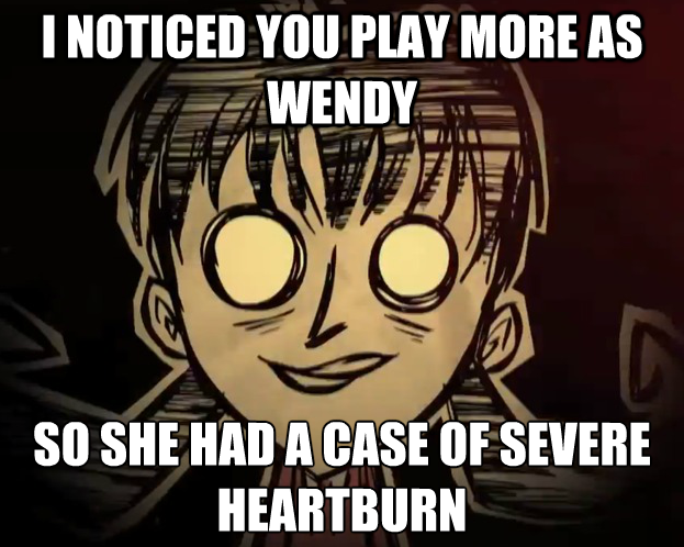 ARamblingSpider Posted January 1, 2014 Share Posted January 1, 2014 People like Wendy more than Willow?(credit goes to spazmatic for the image) Link to comment https://forums.kleientertainment.com/forums/topic/30553-your-favourite-character-in-the-term-of-personality/page/3/#findComment-396571 Share on other sites More sharing options...