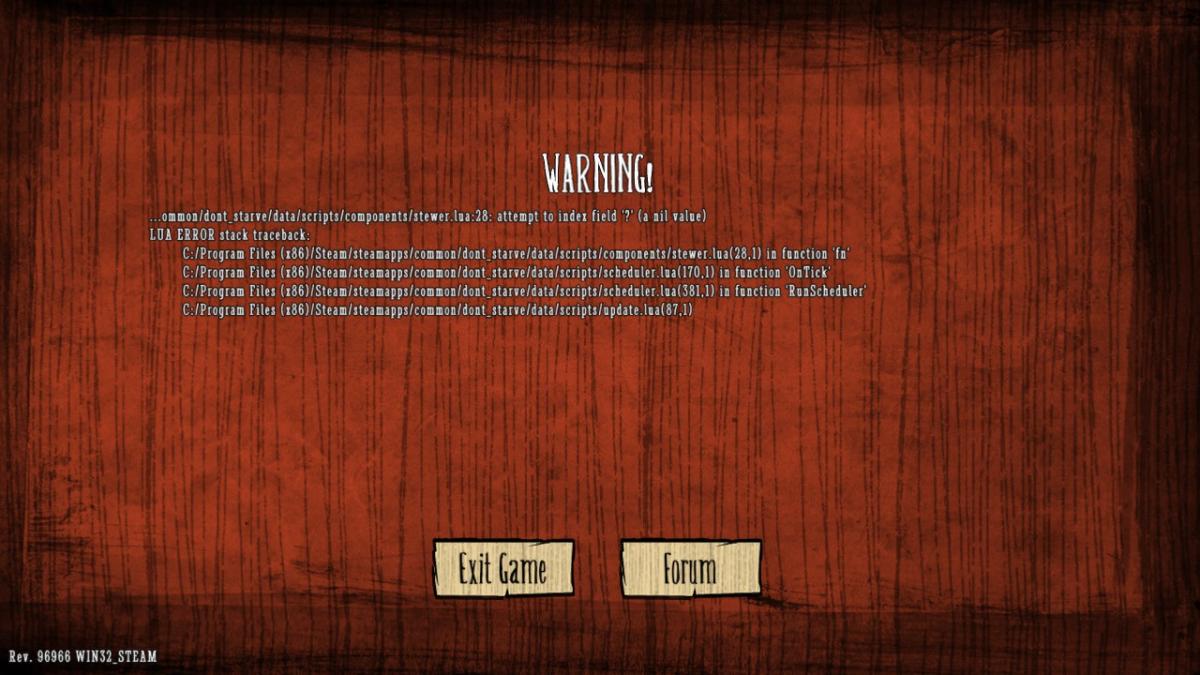 Lumina Posted March 9, 2014 Share Posted March 9, 2014 Hammering the crockpot. http://forums.kleientertainment.com/topic/31998-custom-ingredient-crashes-when-cooked-update-the-cause/?p=424661 Link to comment https://forums.kleientertainment.com/forums/topic/32563-lua-error-nil-value-no-mods/#findComment-427911 Share on other sites More sharing options...