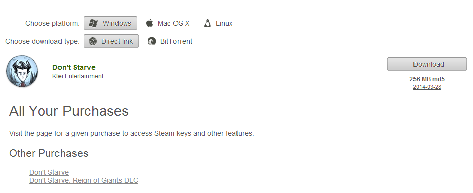 LoayzaPaul Posted April 4, 2014 Author Share Posted April 4, 2014 The Picture you posted at the Beginning is not the early access... Look for yourself: http://dontstarvegame.com/blog/landing/buynow.html Check your Humble Library. i guess you have another Dont Starve entry?Thanks a lot, but when I bought Don't Starve, I bought it with soundtrack, this year I bought RoG the first time that was released, then when the official wedsite had a change and added the RoG, my Humble Library changed like if I have bought DS + RoG, Yesterday I report that, then I refreshed my Humble Library and my Sountrack is back Link to comment https://forums.kleientertainment.com/forums/topic/33963-humble-store/#findComment-444279 Share on other sites More sharing options...