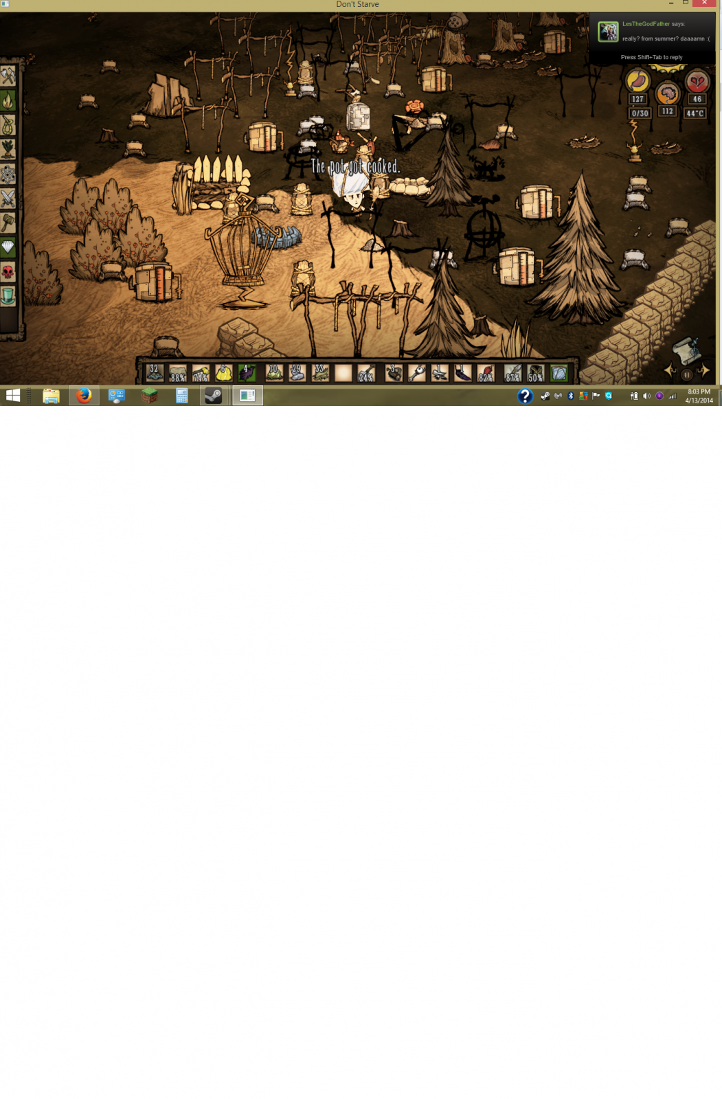 Went to trade some monster meat for meats and skins only to realise that dusk came and the pigs went home, wanted to go back home but Abigail decided to play with some beefalo in heat and the hounds decided to visit so I made an extra torch and put on my armor and bush hat, equipped my torch and hid in the herd before they noticed me, but wendy got out of disguise at the wrong time and made beefalo angry at me so I ran towards the village at the same time the hounds came so I ran in circles to get the hounds to agro on the beefalo, then hid again when they went after the beefalo. The good thing?