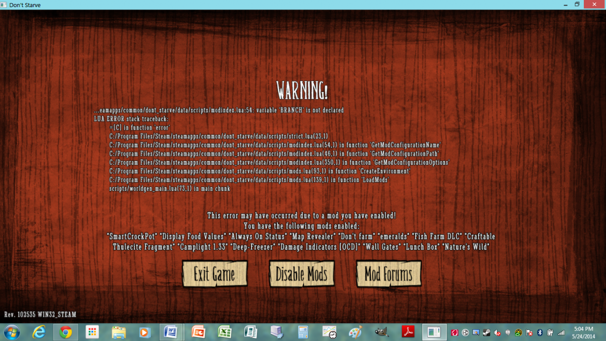 inkyynki12 Posted May 24, 2014 Share Posted May 24, 2014 Hi, I love Don't Starve, and I play it with mods. So today, I started a new world, and on the loading screen, the game crashes. I don't know what the cause is, but it is very frustrating because I cannot play the game. I hope you can help fix the issue. Here is a link for the picture: http://tinypic.com/r/kcl3ew/8 Link to comment https://forums.kleientertainment.com/forums/topic/36797-dont-starve-crash/ Share on other sites More sharing options...