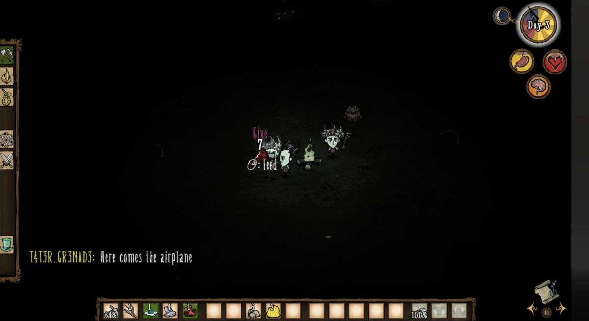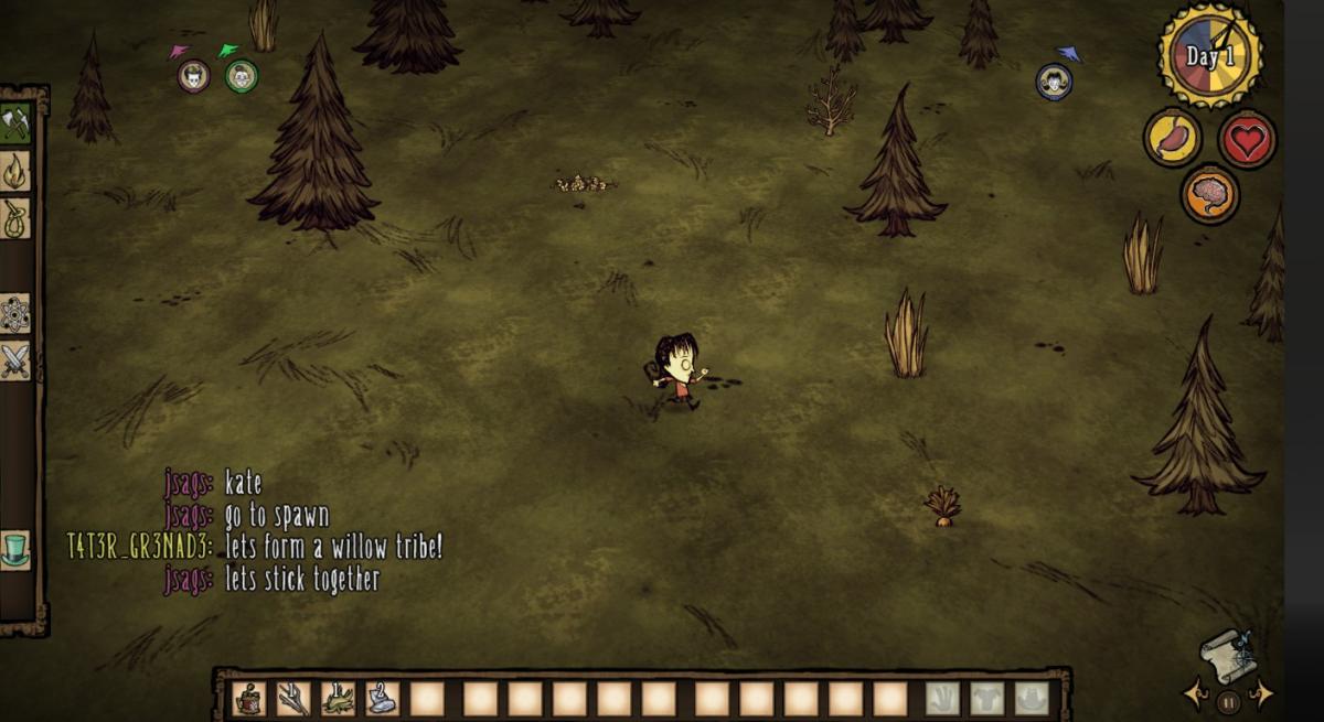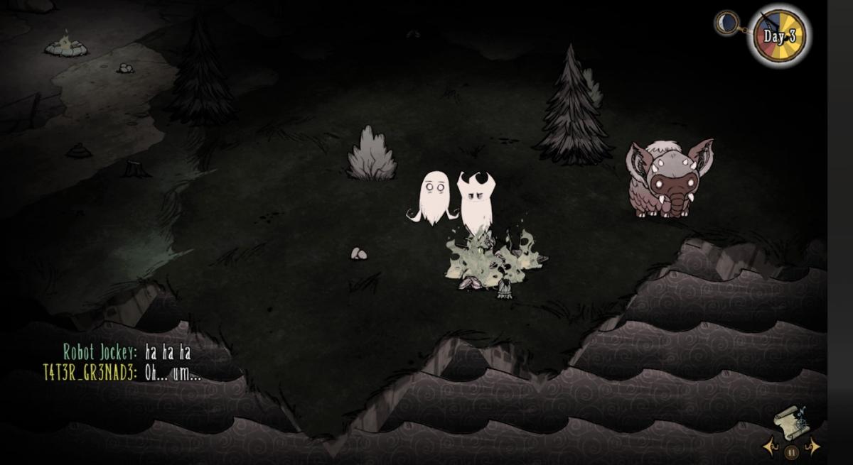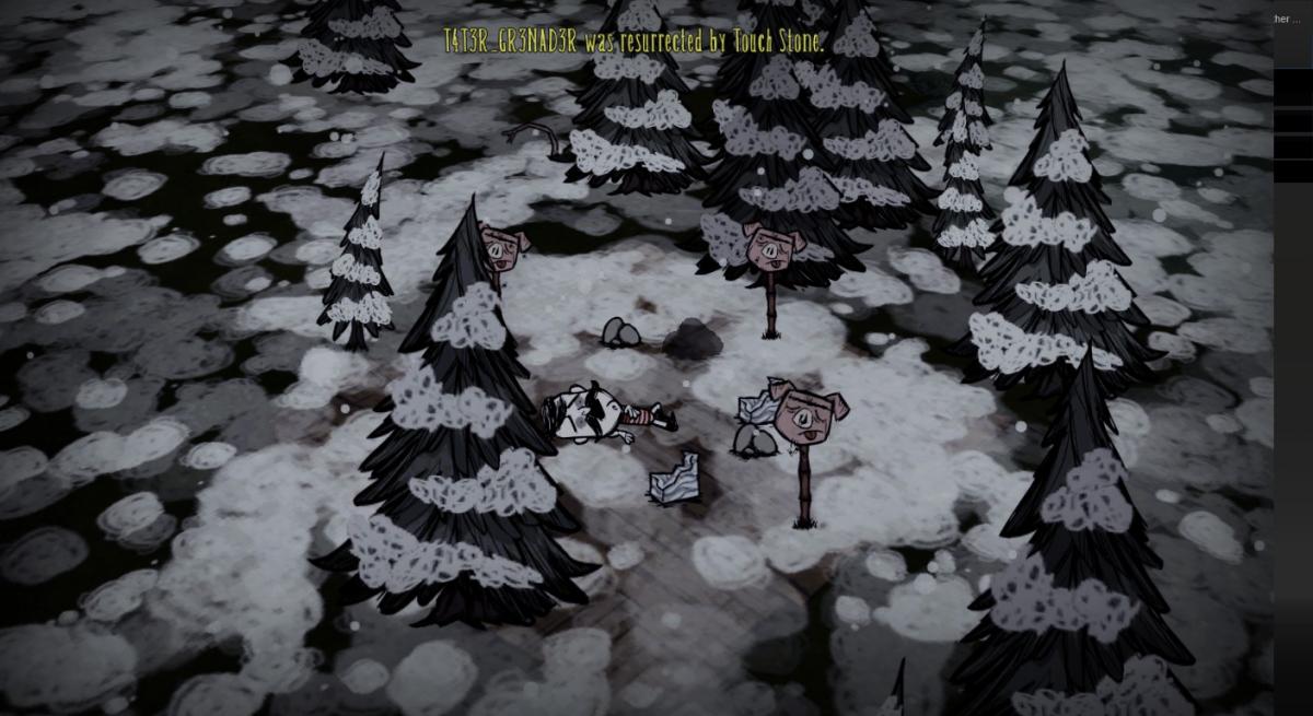 T4T3RGR3NAD3R Posted December 9, 2014 Share Posted December 9, 2014 Last night, I got my beta keys, and after coming home from school today I started to play. I joined a dedicated server, and found myself as the only person alive. I picked selected Random, and ended up as Wolfgang. Oddly enough, since the server day appeared to be 8, it was Winter. I began to freeze to death. I had promised to revive some people, since I was Wolfgang and had high health. However, this now seemed unlikely to happen. I did manage to get a torch and sustain myself for a while, but I eventually died an icy death. As a wandering mustachioed spirit, I eventually stumbled upon a touchstone! I made use of it. I guess somebody else joined then died, so that's how was able to exist as a ghost. People started telling me to kill myself so the server would reset. Shortly afterward, I walked into the fire I was using to warm up and lost my remaining 3 health. I chose Random again and got Willow. I suggested that the other Willows and I form a Willow tribe. However, everything went to s***. People started dying. Because of that, people went insane. Because of that, shadow monsters showed up. Because of that, more people tarted dying. I was killed by a crawling horror. Drifting around, I found a lonely Wilson who had given up on fighting a Koalaphant. I tried to help him by chasing the beast towards him, but it was no use. That night, it fell asleep. I floated over to Wilson's campfire and whispered "He's asleep." The scientist ran up and smacked the hairy behemoth with a torch. It caught fire and delivered a single fatal blow to Wilson. The blaze spread to his items. We both laughed about it. We started chasing the creature around the map. Eventually, I decided to search for a touch stone instead. I did find a generous Wickerbottom who gave me a heart. Back in human form, but itemless, I scrounged around for torch materials. I found them, then constructed my nighttime aid. After a bit of walking, I stumbled across my ghostly friend from before. He still had the Koalafant. Unable to resist, I gave it a firm whack with my torch. After running around on fire, the beast charged at me. I dueled it for I while. I decided to bail when morning broke. I don't know if it was lag, a glitch, or something else, but as I was fleeing, the Koalafant, who was very far away at the time, somehow struck the final blow. Since most people were dead, we organized a mass suicide to res the server again. Now that you know the introduction, here is the story matching the title.Rather than choosing random, I just went with Wilson. I met up with a couple of other folks, a Wilson and, if I remember correctly, a Wendy. We agreed to make a base together. I decided I wanted to become Willow, and, not knowing that character changes weren't a thing, left then rejoined the game. When I returned, I had lost track of my comrades. I walked around for a while, and eventually stumbled upon a pig village. There I found a vast multitude of berry bushes. I proceeded to pick the delicious fruits. I remember coming across a Wendy, though I'm not sure if it was the same one from earlier. Not long later, night fell. Torch in hand, I wandered about. To my dismay, I ran into a crowd of spiders! I started to run away, but then I noticed my torch was running low! If I tried to craft a new one, my pursuers would catch me! I tried and failed to construct a light. The spiders had done a number on me, I was in the dark, and Charlie was descending upon me. Just as she was about to strike, day broke. I was so relieved. I shook the spiders and continued wandering. I came across the Wilson from before. We set out together, looking for a place to set up camp. We came across another Wilson who had secured the Eyebone! The three of us decided to camp near a herd of Beefalo. That night by the fire, I offered to share my berries with by camp-mates. I proclaimed "Hear comes the airplane!" and fed the hungry one of the two. The other declined my offer. In exchange for the food, I was given a garland. So pretty. The next morning, we had the bright idea to try and kill a beefalo. We all scattered when they started chasing us. I was hit once or twice, but I survived. The Wilson without the Eyebone had no such luck. After floating around for a bit, he left the game. The remaining Wilson and I existed peacefully together for a couple days. At one point, he asked me if I knew of a rocky biome. I had found one in my earlier travels, so we decided to set out in the morning. Along the journey I killed a couple of gobblers. Some guy also started shouting about how a couple of people were...er...lady parts for killing him.When we reached our destination, it started out as peaceful mining. Eventually, we came across a tallbird. That was the firstĀ time I saw a tallbird lay an egg. Despite being a bit sickened, I was somewhat appetized. I instructed my partner to distract the bird whilst I grabbed the egg. I had pulled this off before, so I was fairly confident that I would succeed. Unfortunately, this tallbird was more relentless than the one from my earlier stunt. It chased me for what felt like an eternity. After a while, I stumbled upon a mighty Wolfgang and a Wendy. Their usernames seemed...familiar. They were the two people that guy was shouting about earlier! The guy in question had been raging about things for most of my play time, so I figured they were probably okay. I watched in awe as they effortlessly beat down my feathery pursuer. I thanked them for the help. They remained silent. That is when I started to feel suspicious. I was a fool! I had lingered too long! I began to walk away, but then Wolfgang crashed his torch down upon my head! I began to flee, and he did not give chase. The blow was not enough to kill me, but I was on fire! I started stuffing my face with petals, but it was no use. The flames consumed me, and my assailants consumed all my food. I instructed them to choke 