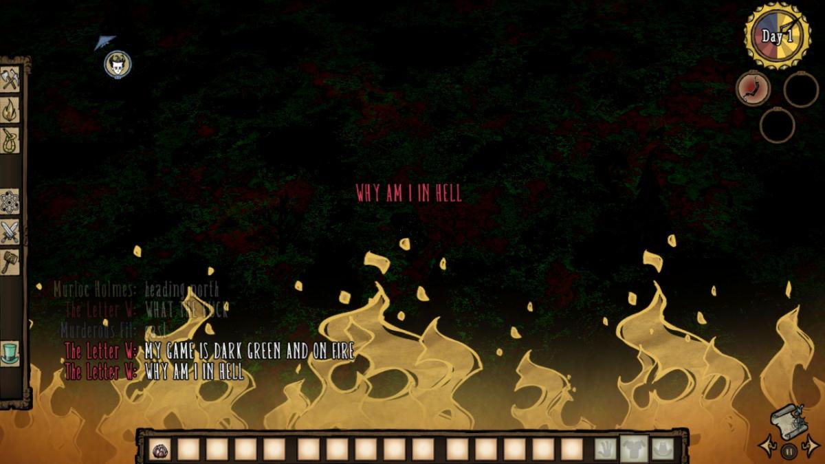XirmiX Posted February 5, 2015 Author Share Posted February 5, 2015 This is what happens when something goes wrong with player_classified. My guess is that it sends the values of net variables for a given entity as a list (i.e. without labels), and that a mismatch between the client and the server results in all of the data being wrong (e.g. istakingfiredamage). Might not be exactly that, but it always seems to crop up when there are mismatches in netvars. Edit: It also sometimes seems to happen the first time you rejoin a server after crashing out of it, at least with mods. I was running into it pretty reliably this way when testing Throwable Spears.So, what you're saying is that in the data folder, somewhere in some lua file there is a code part that says: If player_classified == False then give Hell_mode Link to comment https://forums.kleientertainment.com/forums/topic/50543-this-is-what-dont-starve-hell-looks-like/#findComment-610110 Share on other sites More sharing options...